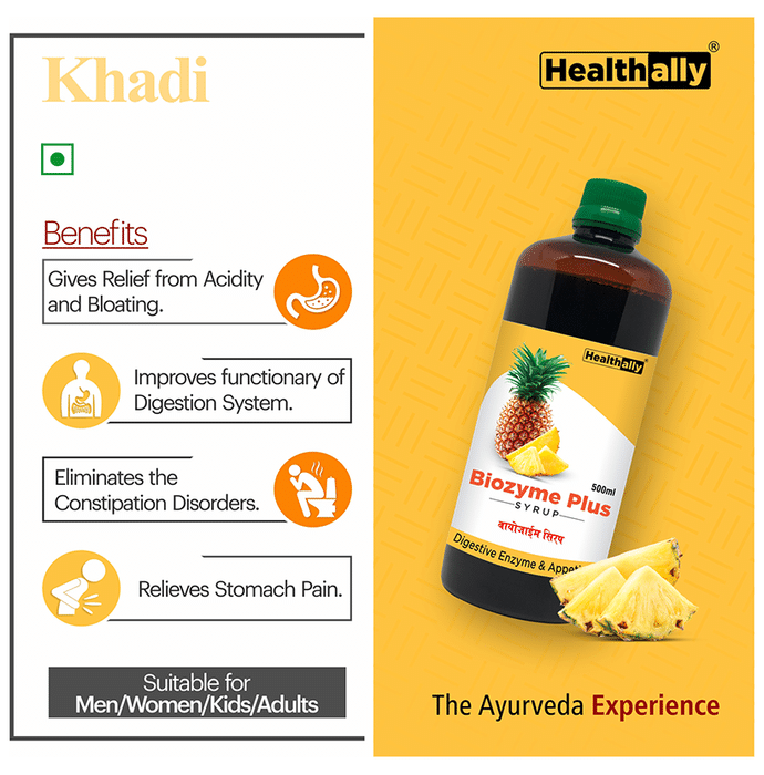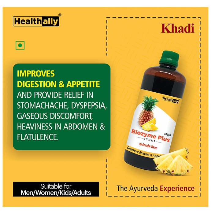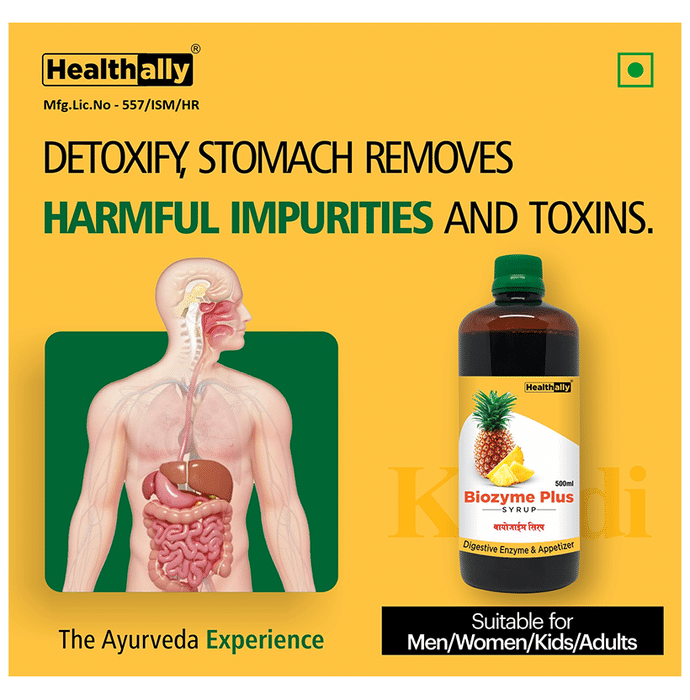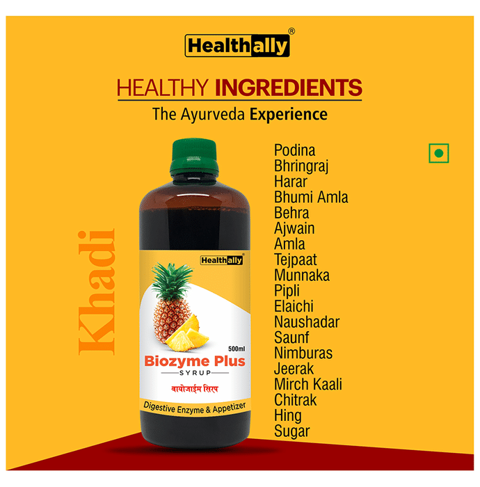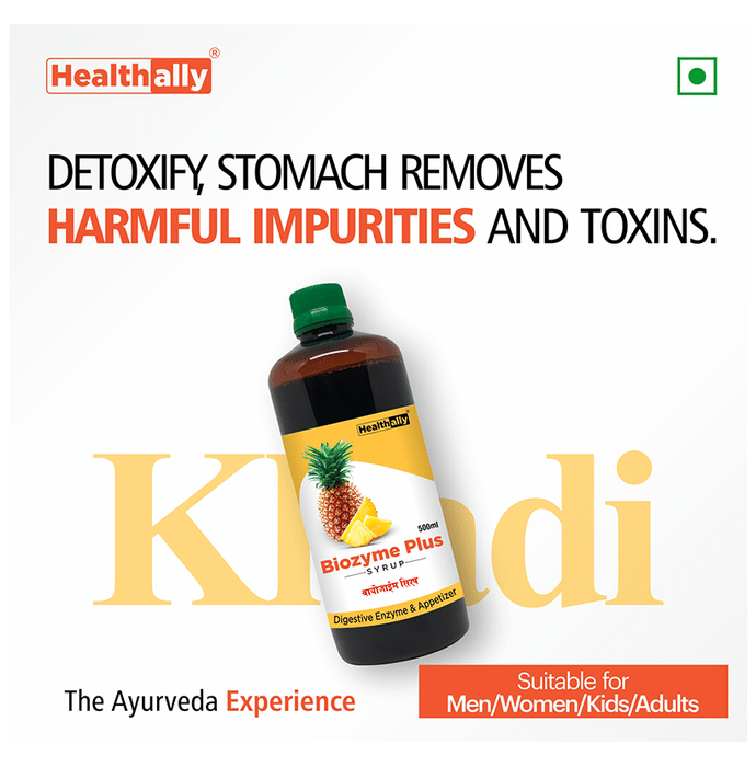 Healthally Biozyme Plus Syrup It is a dietary supplement formulated with pudina, hing, ajwain, saunf, amla and other ingredients that can help aid digestion and relieve constipation. The unique formulation can help manage digestive problems like gas and acidity. | Key Ingredients: Pudina Bhringraj Harar Bhumi amla Behra Ajwain Amla Tejpatta Saunf Hing | Key Benefits: It is a dietary supplement that can help aid digestion and manage digestive problems It can help regulate bowel functions and improve digestion It can provide relief in cases of chronic constipation, gas and hyperacidity It helps to detoxify the stomach and remove toxins from it It improves the functioning of the digestive system Hing helps improve digestion by increasing the activity of digestive enzymes in the stomach and small intestine. It might help in the management of flatulence due to its carminative property Active enzymes in ajwain can help relieve bloating, gas and abdominal pain related to indigestion | Directions For Use: Take 2-3 spoons twice daily or as directed by your physician | Safety Information: Read the product label carefully before use Store in a cool and dry place away from direct sunlight Keep out of reach of children Consult a doctor before taking any supplement Do not exceed the recommended dosage Pregnant or nursing mothers, children, and people with medical conditions must consult a physician before taking this supplement Do not use if the product appears to be tampered with or the seal is broken