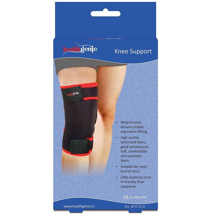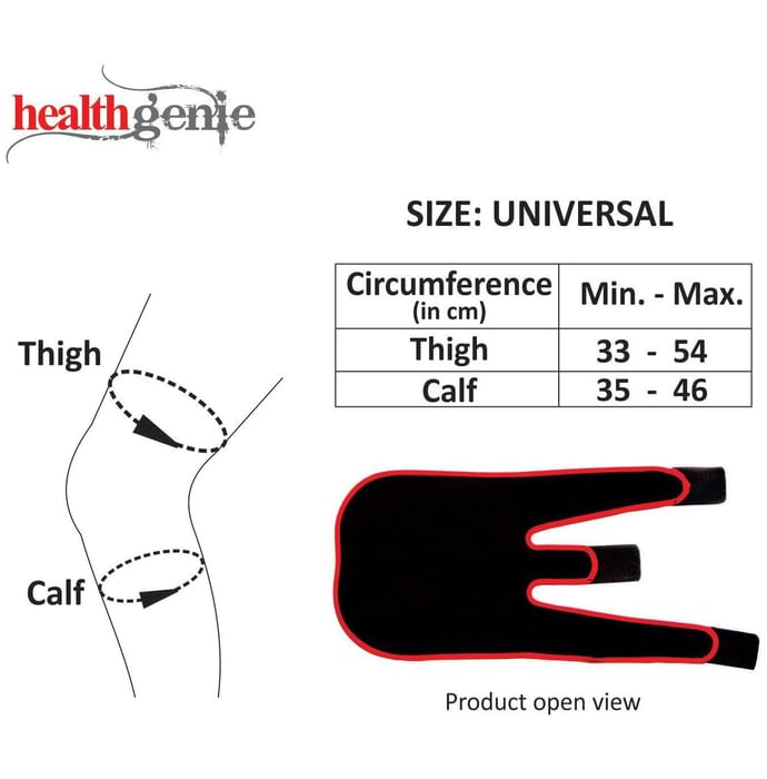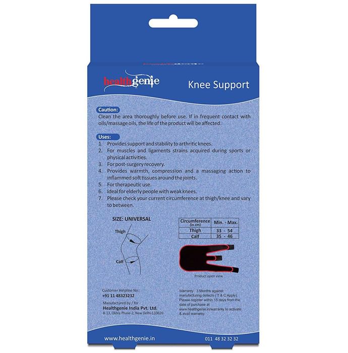 Healthgenie Knee Support is designed to help provide support to the knees and prevent injuries. It helps in reducing pain and perform certain exercises such as leg press, running or jogging and even hiking. | Uses: It is designed to help prevent injuries, reduce pain, and play sports. It can be used while performing leg press, while running on the treadmill, mountain climbing and hiking. | Product Specificationsand Features: Thigh circumference - 33 to 54 Calf circumference - 35 to 46 Ensures proper ergonomic fitting It is made of high quality laminated fabric It has a soft, comfortable and washable fabric | Directions For Use: Use as directed on the manual. | Safety Information: Read the label carefully before use Store in a cool dry place away from direct sunlight Keep out of reach of the children