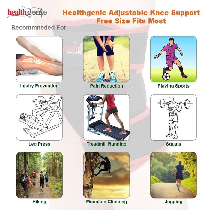 Healthgenie Knee Support Healthgenie Knee Support is designed to help provide support to the knees and prevent injuries. It helps in reducing pain and perform certain exercises such as leg press, running or jogging and even hiking.