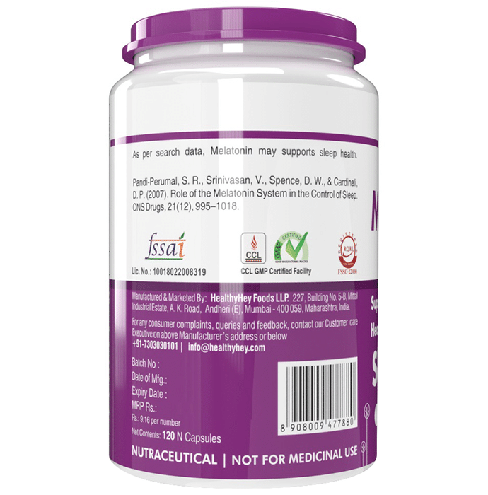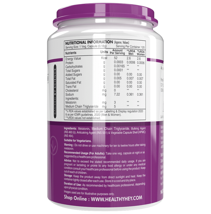 HealthyHey Melatonin 3mg Vegetable Capsule HealthyHey Melatonin 3mg Vegetable Capsule is formulated to promote sleep and relaxation. The capsule is beneficial in treating certain first-degree sleep disorders. In addition to this, it assists in controlling the sleep and wake cycles.