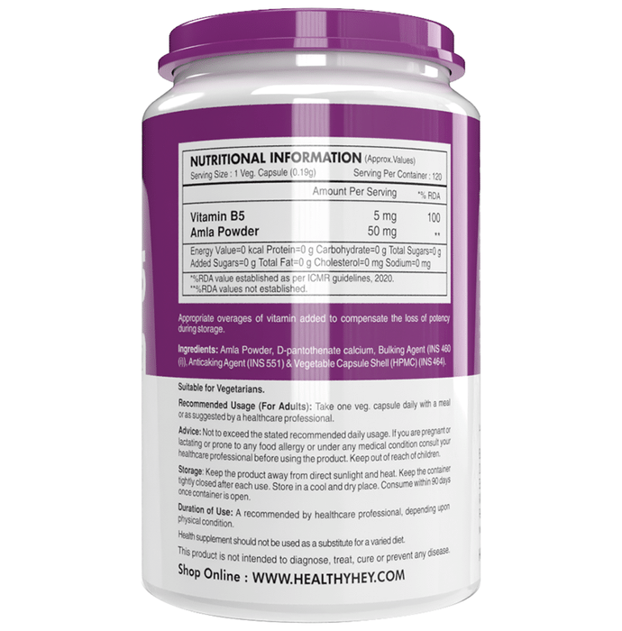 HealthyHey | Nutrition Vitamin B5 5mg Vegetable Capsule is made using vitamin B5, also known as D-Pantothenate, which is a water-soluble vitamin that your body needs for several functions. Consuming adequate amounts of vitamin B5 is important for optimal health and may even prevent and treat several health conditions. | Key Ingredients: Vitamin B5 | Key Benefits: Help the body convert food (carbohydrates) into fuel (glucose), which the body uses to produce energy B complex vitamins help the body use fats and protein Pantothenic acid plays an important role in the growth and normal functioning of the body tissues | Directions For Use: Take one veg capsule once daily with a meal or as suggested by a healthcare professional. | Safety Information: Read the label carefully before use Keep out of reach of the children Store in a cool dry place