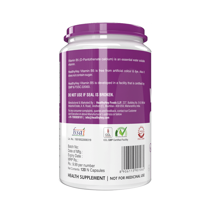 HealthyHey Nutrition Vitamin B5 5mg Vegetable Capsule HealthyHey Nutrition Vitamin B5 5mg Vegetable Capsule is made using vitamin B5, also known as D-Pantothenate, which is a water-soluble vitamin that your body needs for several functions. Consuming adequate amounts of vitamin B5 is important for optimal health and may even prevent and treat several health conditions.