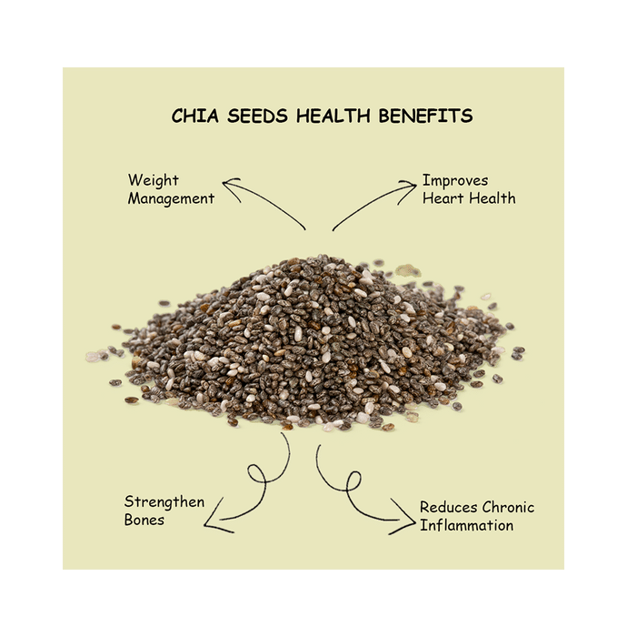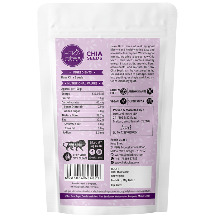 Heka Bites Chia Seeds contain healthy omega-3 fatty acids, protein, fibre, antioxidants, and calcium, which can help in weight management, and may also protect skin cells against oxidative damage. These seeds can be consumed as is, soaked and added to porridge, made into pudding, taken with smoothies and juices, or simply sprinkled on top of salads or yoghurt. | Key Ingredients: Raw Chia Seeds | Key Benefits: Rich in omega-3 fatty acids, calcium, fibre and protein which may help maintain heart health and strengthen bones Contains antioxidant properties that can protect skin cells against oxidative damage and keep them healthy Has anti-inflammatory properties and might reduce the risk of heart diseases Might help regulate blood sugar levels, improve digestion, and may help manage diabetes | Directions for Use: Use as directed. | Safety Information: Read the label carefully before use Store in a cool and dry place away from direct sunlight Keep out of reach of children