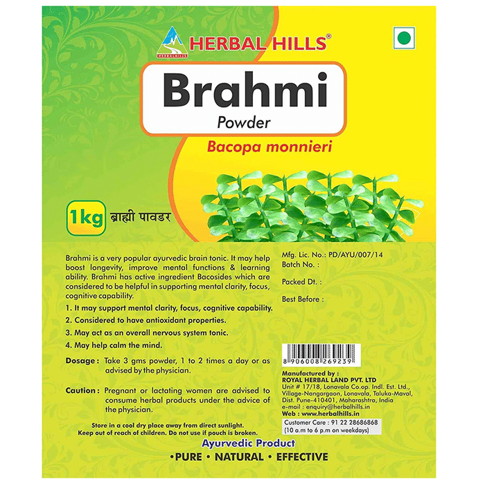 Herbal Hills Brahmi Powder Herbal Hills Brahmi Powder contains Brahmi (Bacopa Monnieri) as the active ingredient. Key benefits/use of Herbal Hills Brahmi Powder: Role of Brahmi (Bacopa Monnieri): - Boosts longevity, improve mental functions & learning an ability - Supports mental clarity, focus, and cognitive capability - Acts as antioxidant - Beneficial for the treatment of fever, fatigue, abdominal pain due to gas formation, nervous disorders, infertility, and bronchitis - Useful in the treatment of inflammation, gout, rheumatism - Useful in the treatment of a cough, and cold - Acts as antistress agent and helps to relieve stress Directions for use/Dosage: - Take 3 gm of Herbal Hills Brahmi Powder, 1 to 2 times a day or as directed by the physician Safety information: - Read the label carefully before use - Do not exceed the recommended dose - Keep out of the reach and sight of children