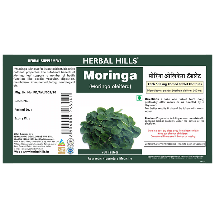 Herbal Hills Moringa 500mg Tablet Value Pack Herbal Hills Moringa Tablet contains Powder of Shigru leaves as active ingredients. Key benefits/uses of Herbal Hills Moringa Tablet: Role of active ingredients: Powder of Shigru leaves: - Acts as an antioxidant & anti-inflammatory agent - Helps bone and joint wellness - Boost immune system, energy levels and improve vitality, focus, and stamina - Maintain blood pressure levels within a normal range Directions for use/Dosage: - Take 1 tablet twice daily or as directed by the physician Safety information: - Read the label carefully before use - Do not exceed the recommended dose - Keep out of the reach and sight of children