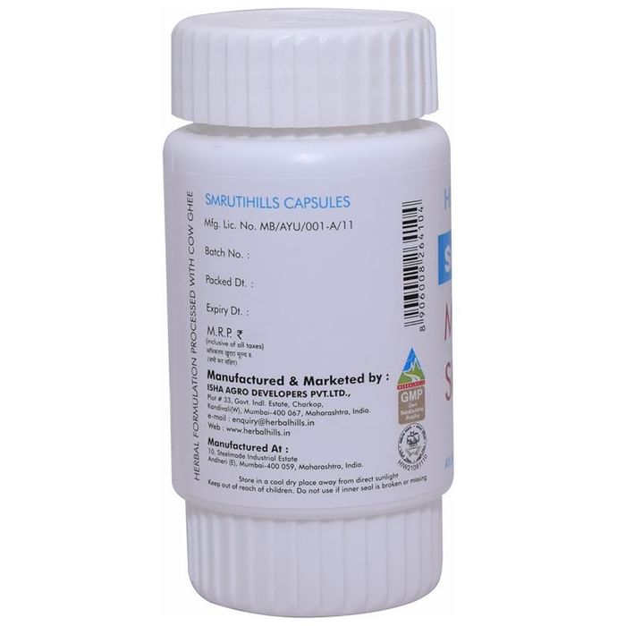 Herbal Hills Smrutihills Soft Gel Capsules Herbal Hills Smrutihills Capsule is a 100% herbal and organic capsule that has its positive effect on your nervous system. It helps to relax your nerves, in turn, affecting your mind. It helps to boost your concentration power and increase memory thus freeing you from any kind of stress and anxiety. This is a protein enriched capsule that sees its benefits to cure almost all mental and nerve issues.
