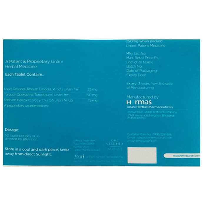 Hermas Mushil Tablet It relieves heartburn, gastrointestinal problems, irritable bowel syndrome and hyperacidity. It helps with nausea and stomach cramps, particularly after consuming spicy foods or beverages. | Key Ingredients: Pistacia lentiscus Rheum Emodi Aloe barbadensis Cassia angustifolia | Key Benefits: It is gentle on the stomach and doesn’t cause gastric irritation or ulcers It relieves one from indigestion and restores lost appetite Is extremely helpful in providing relief from diarrhoea and constipation It might also be effective in the treatment of intestinal infections | Directions For Use: Use as directed on the label or as advised by your healthcare provider. | Safety Information: Read the label carefully before use Store in a cool and dry place away from direct sunlight Keep out of reach of children
