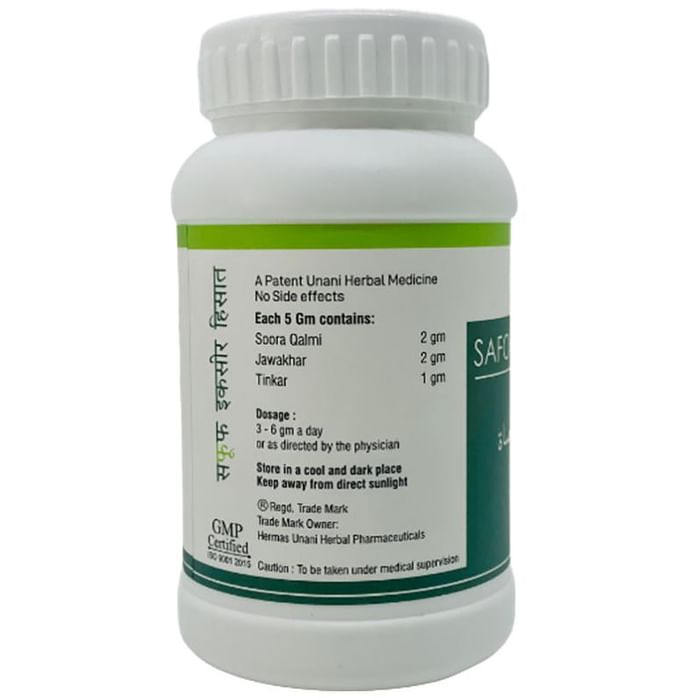 Hermas Safoof Iksir Hisath It maintains normal bowel regularity, normal bacteria and yeast levels, and helps detoxify and recondition the intestinal tract. It improves the immune system and prevents recurring infections in the urinary tract. | Key Ingredients: Soora qalmi Jawakhar Tinkar | Key Benefits: It is helpful in case of kidney and ureter stones It helps to relieve the urinary tract blockage It helps to dissolve the stones in the kidney It might help to dissolve kidney, ureter and bladder stones | Directions For Use: Use as directed on the label or as advised by your healthcare provider | Safety Information: Read the label carefully before use Store in a cool and dry place away from direct sunlight Keep out of reach of children
