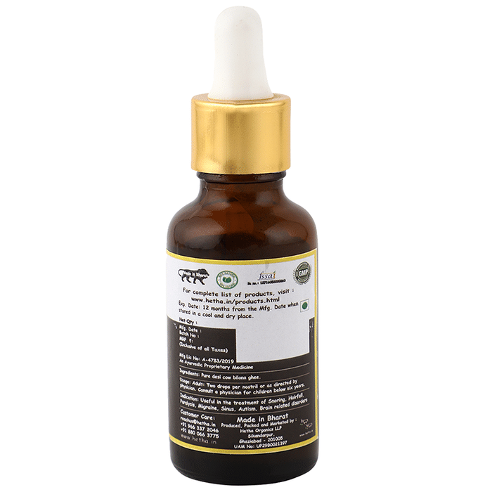 Hetha Bilona Ghee Nasal Drops Himalayan Badri cows graze on the fresh herbs and shrubs of the Himalayas. The ghee is made using the traditional curd churning process, making it one of the most nutritious and premium quality ghee. Since ancient times, ghee nasal drops can help maintain overall health and wellbeing in India. | Key Ingredients: Badri cow A2 cultured bilona ghee | Key Benefits: This gaumutra is from indigenous (desi) cows only It may help cure snoring and insomnia It may reduce hair fall and paralysis It may nourish and increase brain and memory power It can relieve headaches (due to stress, migraine, etc.) It can boost immunity and manage allergies It can maintain mental health | Directions For Use: Put two drops per nostril | Safety Information: Read the label carefully before use Store in a cool and dry place, away from sunlight Keep out of reach of children Use under medical supervision
