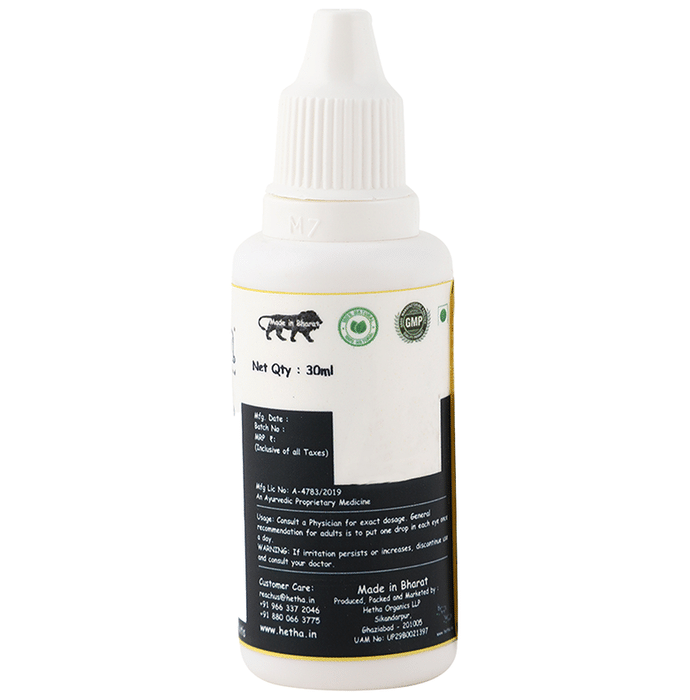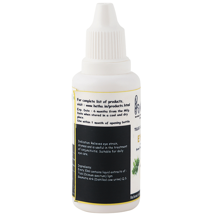 Hetha Tulsi & Gaumutra Ark Based Eye Drop Hetha manages its own herd of Gir, Sahiwal and Tharparkar heifers, cows and bulls. Organically grown hydroponics grass, carrots, sugarcane, and other seasonal fodder are fed to the heifers, cows and bulls. | Key Ingredients: Tulsi gaumutra ark | Key Benefits: This gaumutra is from indigenous cows Tulsi gaumutra ark-based eye drops can help keep your eyes healthy, reduce eye strain and improve vision It may help with reducing the strain on the eyes due to long hours of screen time, irritation in the eyes due to pollution, redness/inflammation of the eyes It can manage eye strain and eye infections It can help manage dryness and conjunctivitis It is suitable for daily care | Directions For Use: This medicine is for external use only Use it in the dose and duration as advised by your doctor Check the label for directions before use Hold the dropper close to the eye without touching it Gently squeeze the dropper and place the medicine inside the lower eyelid Wipe off the extra liquid | Safety Information: Read the label carefully before use Store in a cool and dry place, away from sunlight Keep out of reach of children Use under medical supervision
