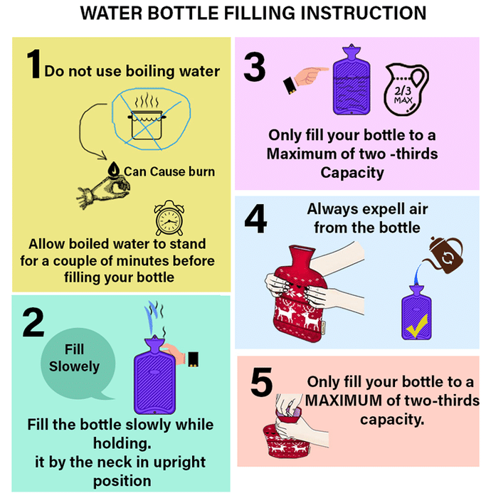 Hicks C-19 Comfort Hot Water Bottle Super Deluxe is made with high-quality, odourless rubber. They are used to provide warmth, typically in bed and for applying heat to a specific part of the body. This hot water bottle is designed with high-quality material and provides effective relief from aches. | Uses: The hot water bottle effectively relieves joint pains, muscular cramps, menstrual pains, stomach, backaches and arthritic and rheumatic pains and helps you relax. | Product Specifications and Features: Made with a high-quality rubber that can resist hot water pressure Provides relief from joint aches and muscular pains Keeps the water hot for a longer time | Leak-proof: Yes Small and compact design makes it handy and easy to carry Can be used as a bed warmer | Good to Know: Not suitable for children under 3. | Directions for Use: Do not use boiling water when filling the bottle Fill the bottle to a maximum of two-thirds capacities Check the bottle for any leakage by holding the bottle in an upside-down position Expel air by lowering carefully on a flat surface until water appears at the opening Screw the cap tightly to ensure that there is no leakage | Safety Information: Never fill the bottle with boiling water Read the label carefully before use Keep out of reach of the children Store in a cool and dry place | Frequently Asked Questions: | For how long does the bottle provide warmth? The bottle can provide warmth for 1-2 hours, depending on the outside temperature. | Can the bottle be completely filled? No, the bottle should always be two-thirds filled. | How to prevent leakages? Always make sure to close the screw tightly to prevent leakages and accidents.