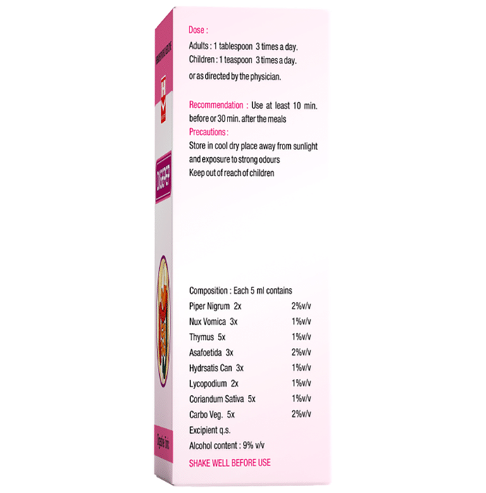 Homeopaths Digepep Syrup is primarily used for treating minor stomach problems like bloating, acidity and stomach pain. It is useful in giving you relief from gas problems and reduces the symptoms of poor food assimilation in your body. | Key Ingredients: Piper Nigrum 2x 2% v/v Nux vomica 3x 1% v/v Thymus 5x 1% v/v Asafoetida 3x 2% v/v Hydrastis can 3x 1% v/v Lycopodium 2x 1% v/v Coriandum sativa 5x 1% v/v Carbo veg 5x 2% v/v Alcohol content: less than 9% v/v excipients q.s. | Key Benefits: This homeopathy syrup is useful in treating stomach pain, bloating and acidity It helps in giving relief from gas and improper food assimilation in your stomach It helps in improving your overall digestive health | Directions For Use: Adults: 1 tablespoon (10ml) three times a day Children: 1 teaspoon (5ml) three times a day It should be consumed 10-30 minutes after meals | Safety Information: Read the label carefully before use Store in a cool and dry place, away from sunlight Keep out of reach of children