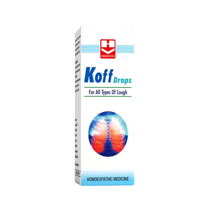 Homeopaths Koff Drop is useful in managing dry, irritating, wet and smoker’s cough and gives relief to your throat. | Key Ingredients: Antim sulph 1000 Bryonia 1000 Ipecac 1000 Squilla M 1000 in equal proportions Alcohol content : 40 % v/v | Key Benefits: It helps in giving relief from different types of cough It helps in dry, irritating, wet and smoker’s cough | Directions For Use: Adults: 15 drops three times a day Children : 8 drops three times a day Dilute in little water if desired | Safety Information: Read the label carefully before use Store in a cool and dry place, away from sunlight Keep out of reach of children