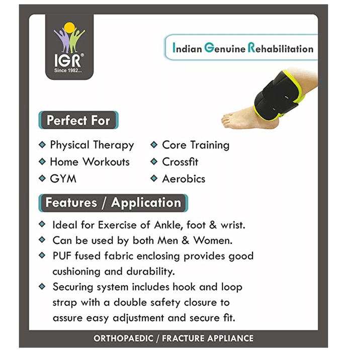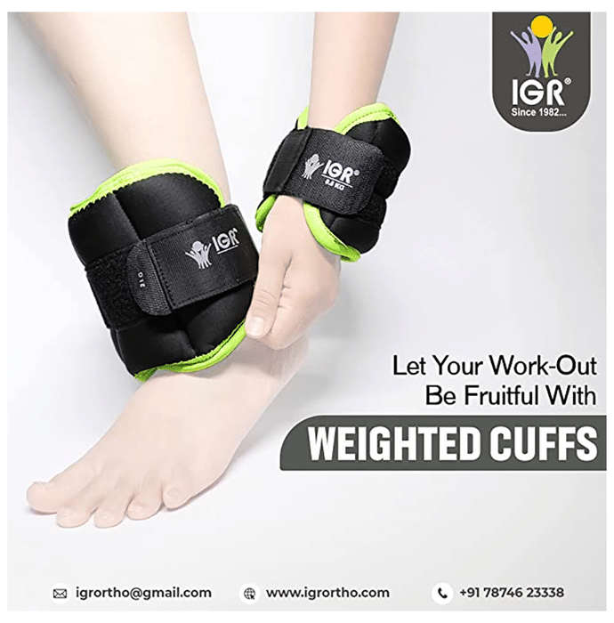 IGR Weight Cuff is ideal for the exercise of the ankle, foot and wrist. | Uses: It is used in physical therapy. | Product Specifications and Features: It has PUF fused fabric enclosing that might provide good cushioning and durability The securing system includes a hook and loop strap with a double safety closure to assure easy adjustment and secure fit It has a metal crystal | Directions For Use: As directed on the product label. | Safety Information: Read the label carefully before use Store in a cool and dry place, away from sunlight Keep out of reach of children