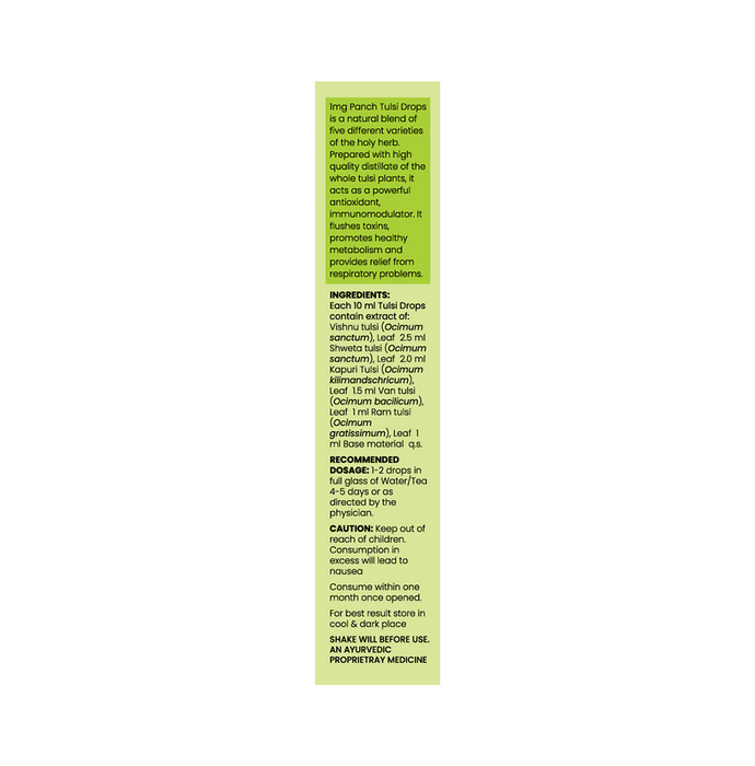Patanjali Ayurveda Giloy Ghan Vati (Patanjali Ayurved Limited) Patanjali Ayurveda Divya Giloy Ghan Vati contains Giloy (Tinospora cordifolia) as active ingredient. Key benefits/uses of Patanjali Ayurveda Divya Giloy Ghanvati: | - Used for the treatment of general weakness, recurrent infections, immuno-deficiency disorders, appetite loss, chronic constipation with mucus in the stool, common cold, high cholesterol, hepatitis, jaundice and other liver disorders and various autoimmune disorders | - Also beneficial in dengue, chicken guinea, skin and urinary disorders Directions for use/Dosage: | - Above 12 years: 1 tablet twice daily | - Below 12 years: Half tablet twice daily or as directed by the physician | Indications: General weakness, common cold, weak immunity, jaundice, liver disorders, dengue etc. | Safety information: | - Read the label carefully before use | - Do not exceed the recommended dose | - Keep out of the reach and sight of children 1mg Panch Tulsi Drops (Delhi Mediart Private Limited) | 1mg Panch Tulsi Drop is a natural blend of five different varieties of the holy herb. Prepared with a high-quality distillate of the whole tulsi plants, it acts as a powerful antioxidant, immunomodulator. It flushes toxins, promotes healthy metabolism and provides relief from respiratory problems. | Key Ingredients: Vishnu tulsi (Ocimum sanctum) Shweta tulsi (Ocimum sanctum) Kapuri Tulsi (Ocimum kilimandschricum) Van tulsi (Ocimum bacilicum) Ram tulsi (Ocimum gratissimum) | Key Benefits: Helps to boost the immunity Provides relief from respiratory problems and infections It has anti-viral properties and helps to improve the metabolism Tulsi leaves can help fight off infections, including colds and cough | Shelf Life: 24 months | Directions For Use: 1-2 drops in full glass of water/tea 4-5 days or as directed by the physician. | Safety Information: Read the label carefully before use Keep out of reach of children Consumption in excess may lead to nausea Consume within one month once opened For best result store in a cool and dark place Shake well before use