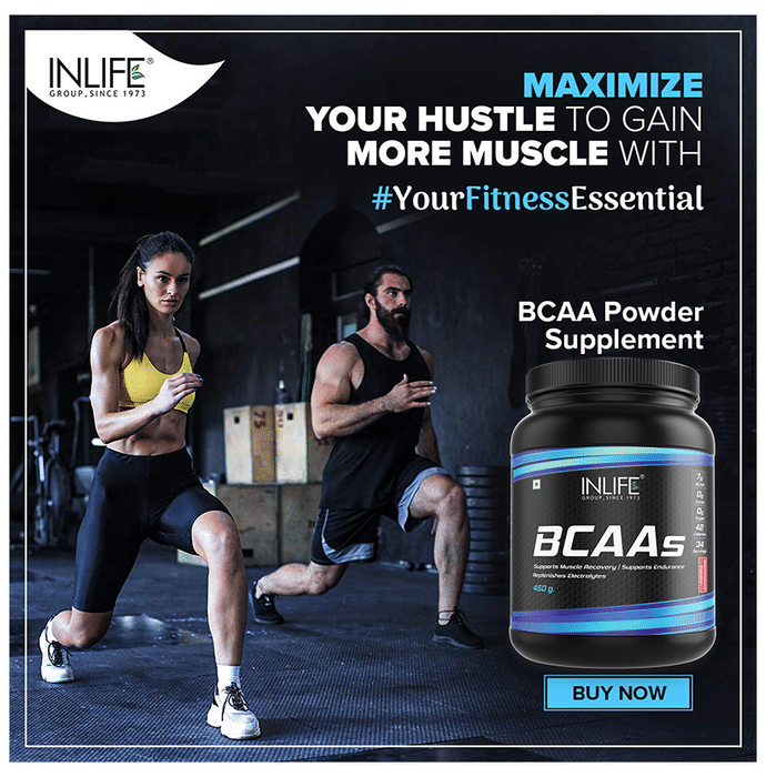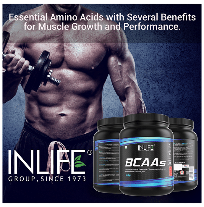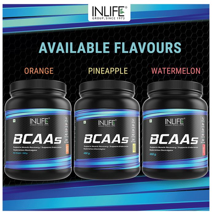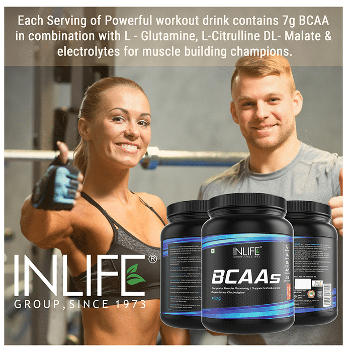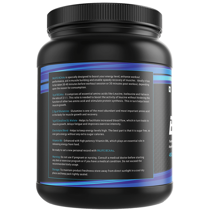 Inlife BCAAs contains a formula engineered with the optimal ratio of 2:1:1. The formula helps to rebuild lean muscle and reduce soreness after a workout. Also contains added electrolytes and will deliver noticeable results in bodybuilding, Crossfit or powerlifting training. Comes in 3 delectable flavours. | Key Ingredients: L-Leucine L-Isoleucine L-Valine L-Glutamine L-Citrulline Malate Vitamin B6 Electrolytes | | Key Benefits: | 7 g (BCAA) Formula: Engineered with the optimal 2:1:1 ratio of L-Leucine, L-Isoleucine and L-Valine, this potent branched chain formula helps to rebuild lean muscle and reduce soreness after a workout. This formula also contains added L-Glutamine, L-Citrulline Malate, Vitamin B6 with Electrolytes and will deliver noticeable results in your bodybuilding, cross-fit or powerlifting training | Muscle building and strength: Boost muscle growth and metabolism with these instantized BCAA branched-chain amino acids that boost muscle strength fast. This 100% pure pre/post workout BCAA powder promotes protein synthesis, boosts lean muscle growth, and minimizes tissue damage that normally occurs after intense strength training, so you can make the most out of your workouts | Muscle repair and recovery: The essential amino acids Leucine, Isoleucine, and Valine acts as transport vehicles for faster absorption, which translates to faster post-workout recovery and better performance results. Electrolytes for hydration to recover from a strenuous workout and help fight muscle breakdown during recovery | Direction For Use: Mix 1 scoop of Inlife BCAA with 240-300 ml of cold water (adjust to taste preferences) of the favourite beverage Shake well and consume regularly, drink plenty of water during the workout | Safety Information: Please consult the physician prior to using the product Read the instruction leaflet/label carefully before use Do not exceed the recommended dose Keep out of the reach and sight of children