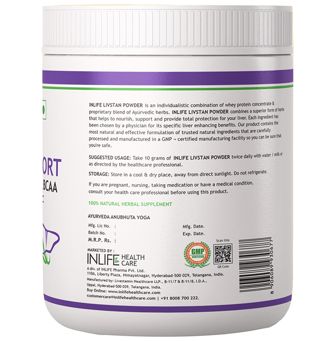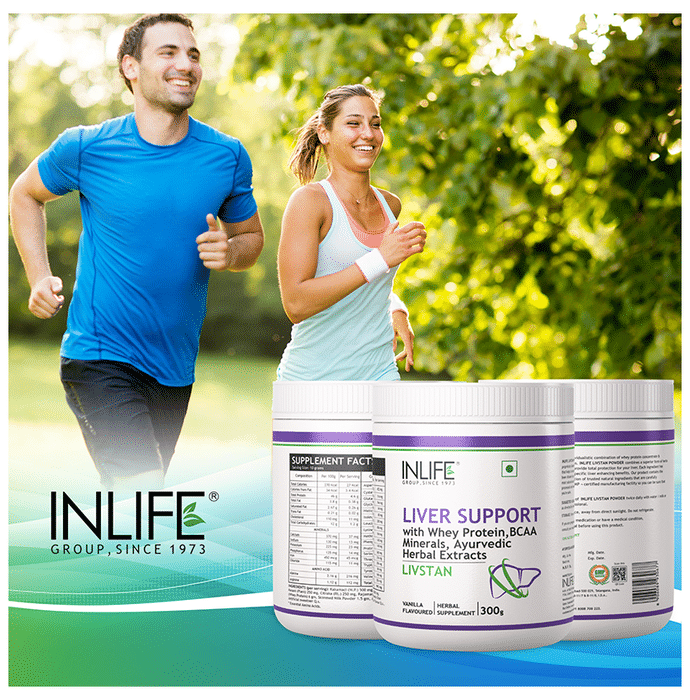 Inlife Livstan Powder Inlife Livstan powder is enriched with Whey protein. It is a herbal comprehensive liver support formula, containing a synergistic combination of whey protein and ayurvedic herbs that supports optimal liver health. It is a powerful antioxidant, free radical scavenger and detoxifier that promotes liver toxin removal. Key benefits: It supports liver function and health. It works as powerful antioxident and helps in liver toxin removal. Safety Information: Pregnant or lactating women, nursing, diabetics and people with known medical conditions should consult with a physician prior to taking dietary supplements. Direction of use: Take 10 grams (2 teaspoons) twice daily with water/milk or as directed by the healthcare professional. Use under medical supervision