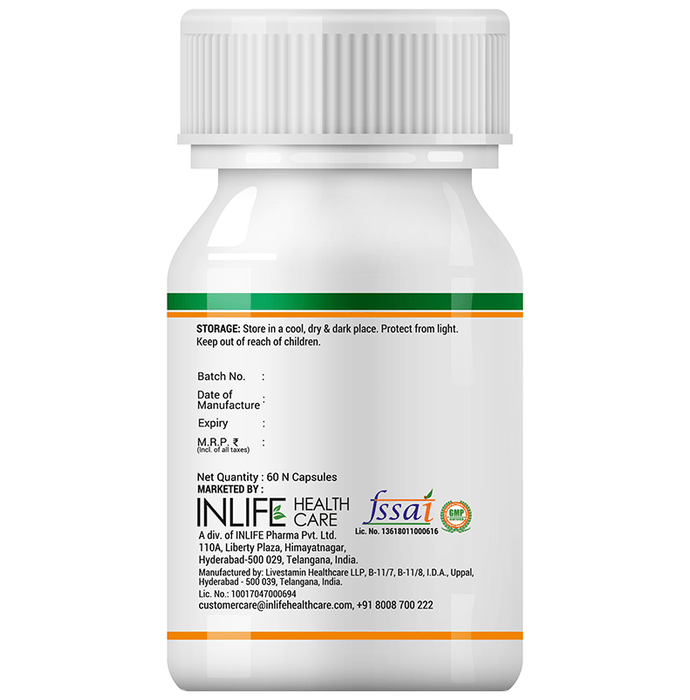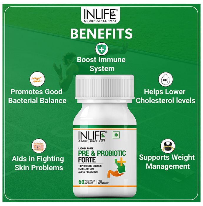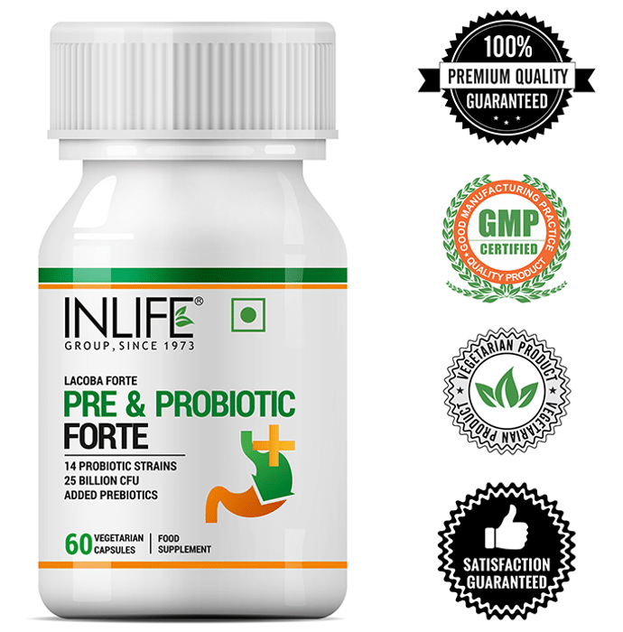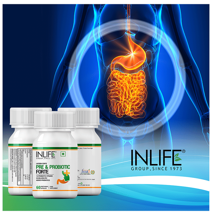 Inlife Prebiotic & Probiotics Forte for Men & Women 25 Billion CFU with 14 Strains Vegetarian Capsule It is a dietary supplement formulated with 25 billion CFUs and 14 probiotic and prebiotic strains to support your immune and digestive health. Probiotics support healthy digestion, nutrient absorption, and immune function. Probiotics may help prevent the growth of harmful bacteria in the gut. It may also help relieve occasional gas and bloating. | Key Ingredients: Probiotic complex with 25 billion CFUs, including L. acidophilus, L. casei, L. gasseri, and L. plantarum Fructo-oligosaccharides | Key Benefits: It is a dietary supplement formulated with probiotic and prebiotic strains and 25 billion CFUs to support your immune and digestive health It helps to regulate cholesterol levels and assists in weight management It helps restore the natural balance of good and bad bacteria in the gut and promotes its healthier functioning Lactobacillus acidophilus helps improve the symptoms of irritable bowel syndrome and diarrhoea Lactobacillus casei promotes a healthy digestive system by relieving the symptoms of diarrhoea Lactobacillus plantarum promotes better iron and calcium absorption and relieves disorders related to diarrhoea Fructo-oligosaccharides help feed the good bacteria and relieve constipation | Directions For Use: Use as directed on the label or as directed by your physician | Safety Information: Read the product label carefully before use Store in a cool and dry place away from direct sunlight Keep out of reach of children Consult a doctor before taking any supplement Do not exceed the recommended dosage Pregnant or nursing mothers, children, and people with medical conditions must consult a physician before taking this supplement Do not use if the product appears to be tampered with or the seal is broken