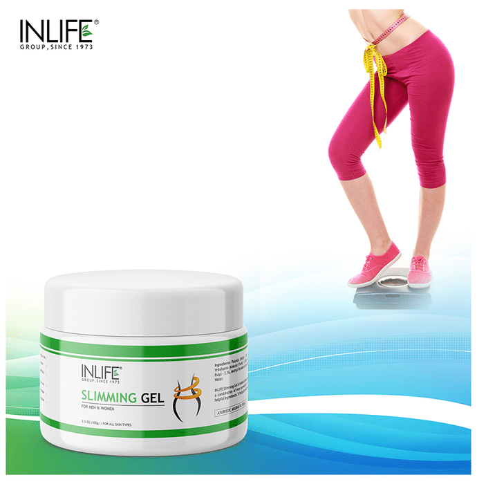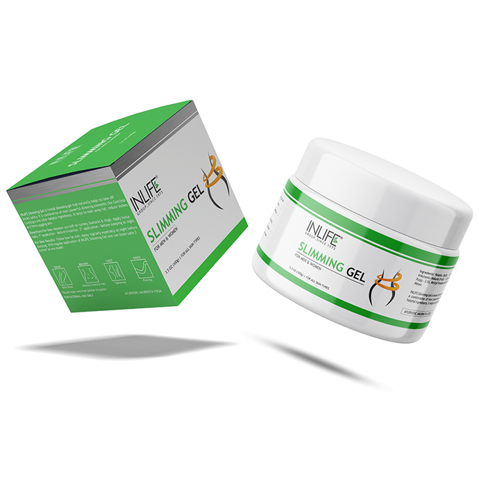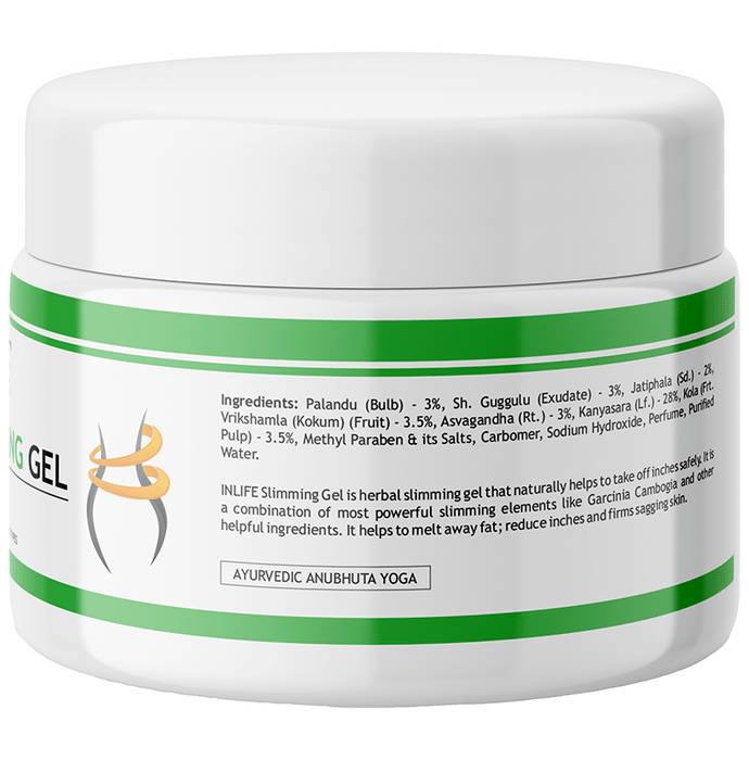 Inlife Slimming Gel contains natural herbs as active ingredient. The herbs support and uplift loose sagging skin, reduce fluffy fat around the tummy, thighs and buttocks. It also helps to maintain ideal shape and is good for all skin types. | Key Ingredients: Palandu Guggulu Vrikshamla Ashwagandha Kanyasara | Key Benefits: It helps in inch loss and skin tightening Works on subcutaneous fat Helps to firm the sagging skin Promotes lowering of cellulite levels | Directions for Use: Apply slimming gel twice daily- 1st application – before breakfast and 2nd application – before sleeping at night Massage the gel in upward direction on the fatty areas of your body until the gel is absorbed completely. This could be followed with a form of exercise for 10 – 15 minutes like brisk walking, jogging and cycling An alternate form is application of heat for 8 – 10 minutes under Sauna belt, Hot towel wraps, Heat therapy in conjunction with body wraps | Safety Information: Read the label carefully before use Keep out of the reach of children Store in a cool, dry and dark place Protect from direct sunlight