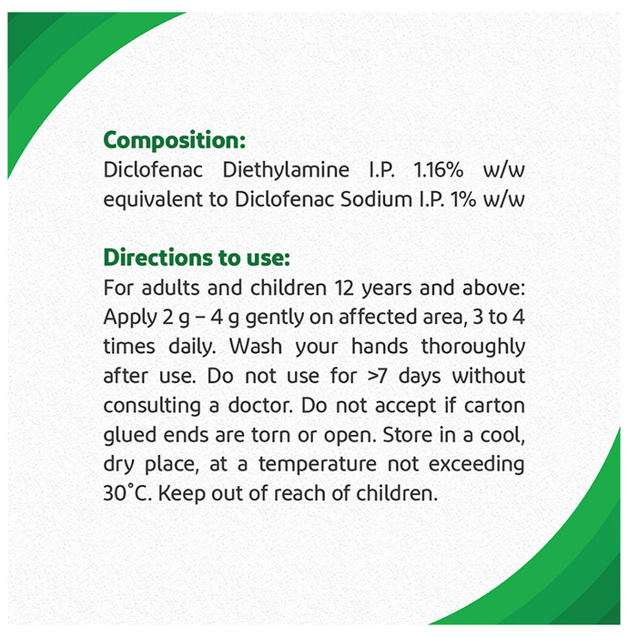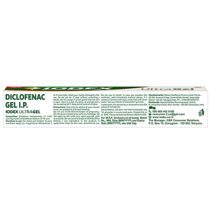Iodex Ultra Gel is a pain relief gel that provides effective and long-lasting relief from multiple types of body pain. It supports better penetration, reduces internal swelling/inflammation (which is generally the cause of the pain) and treats pain at its root. Iodex Ultra gel has a pleasant fragrance and is non-greasy. It provides relief from multiple types of body pain like neck and shoulder pain, back pain, muscular pain, joint pain, sprains and osteoarthritis. | Key Ingredients: Diclofenac Diethylamine I.P. Diclofenac Sodium I.P. | Key Benefits: Iodex UltraGel penetrates skin 7 times deeper and provides effective and long-lasting relief from multiple types of body pain It supports better penetration, reduces internal swelling/inflammation and treats pain at its root Iodex Ultra gel has a pleasant fragrance and has a non-greasy application Beneficial for treating neck and shoulder pain, back pain, muscular pain, joint pain, sprains and osteoarthritis | Directions For Use: Apply 2 to 4 gm gently on the affected area, 3 to 4 times a day and wash your hands thoroughly after use. | Safety Information: Store in a cool and dry place away from direct sunlight Keep away from children Do not use if the seal is damaged or missing For external use only