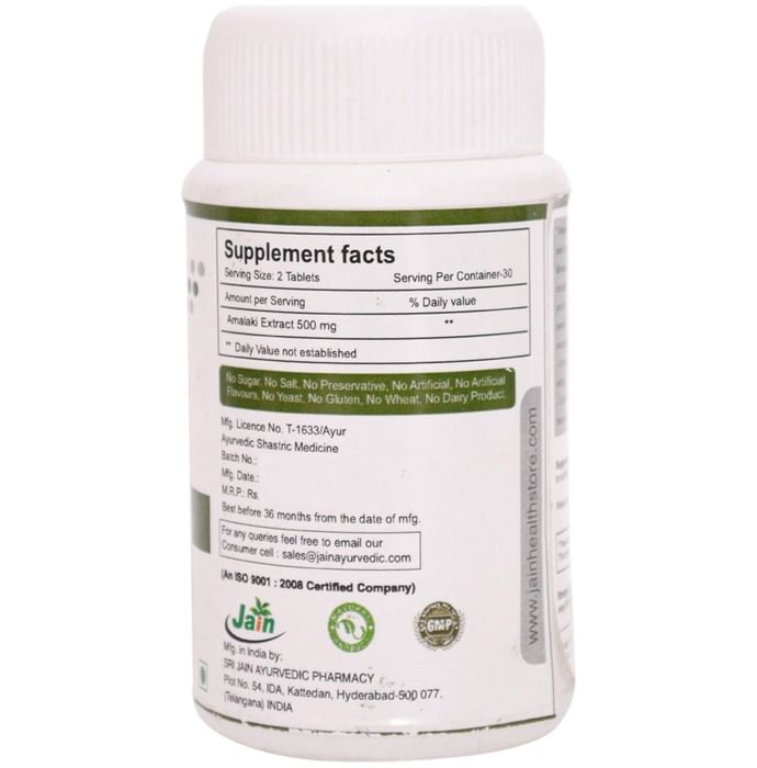 Jain Amlaki Capsule contains Amalaki (Emblica officinalis)(Amla) fruit extract (250 mg). Key benefits/uses of Jain Amlaki Capsule: Role of Amla - Used to remove vitamin C deficiency - Controls blood sugar in diabetes - Lowers cholesterol level - Improves digestion - Treats constipation - Improves blood circulation - Amla is a natural anti-aging agent for skin - Nourishes scalp and hair roots - Encourages hair growth Direction for use/Dosage: - Take 1-2 Capsules of Jain Amlaki twice daily or as directed by the physician Indications: - Vitamin C deficiency, digestion, overall health benefits Storage instructions: - Store the formulation in cool and dry place Safety information: - Read the label carefully before use - Do not exceed the recommended dose - Keep out of the reach and sight of children