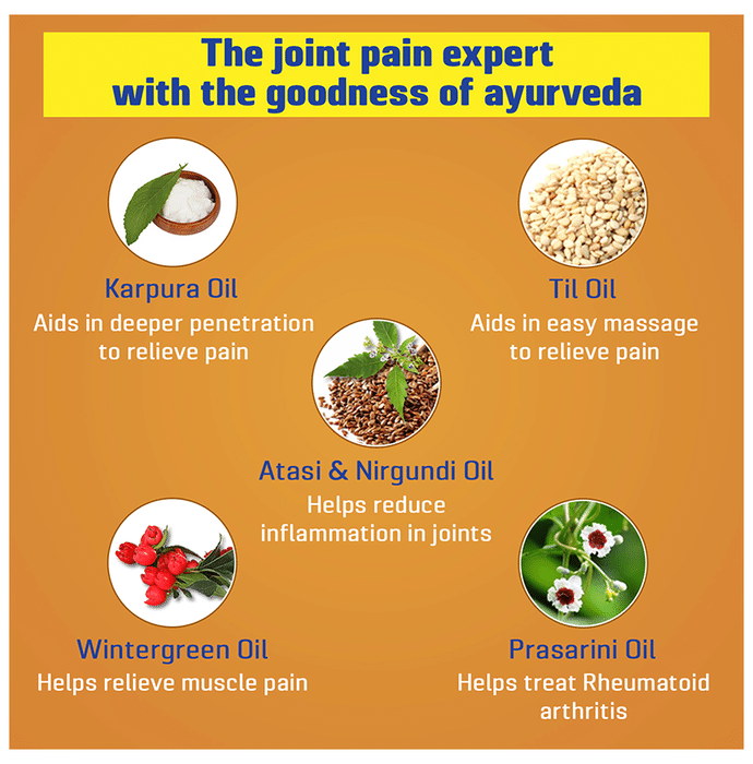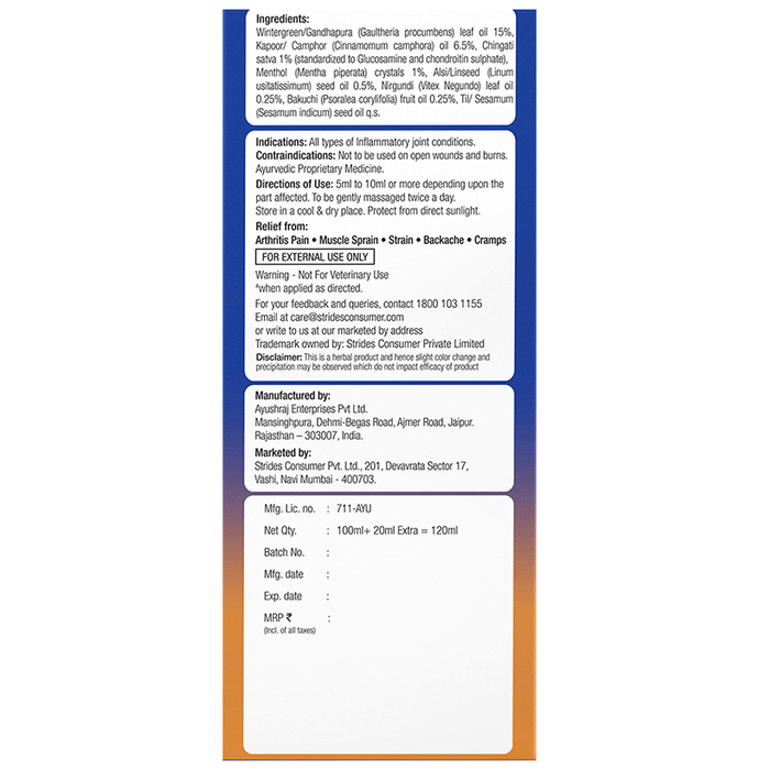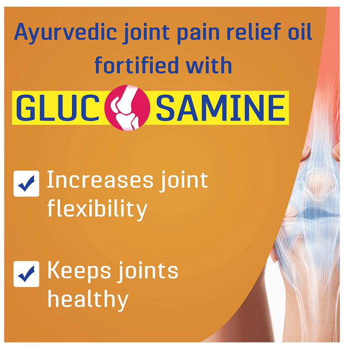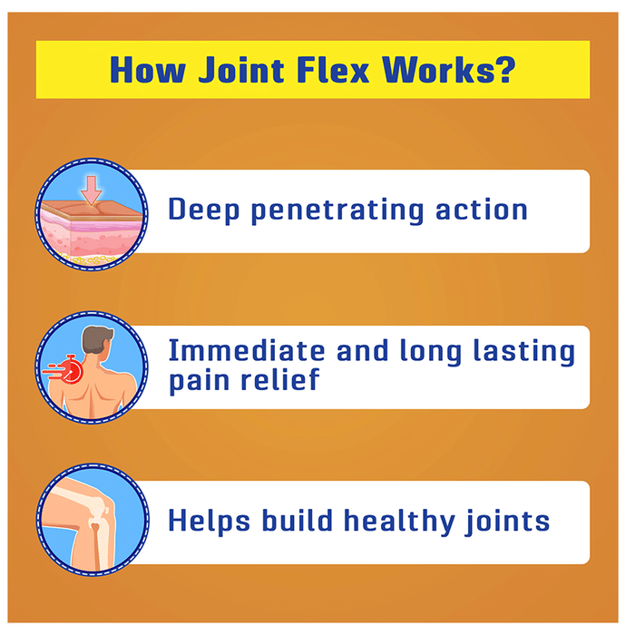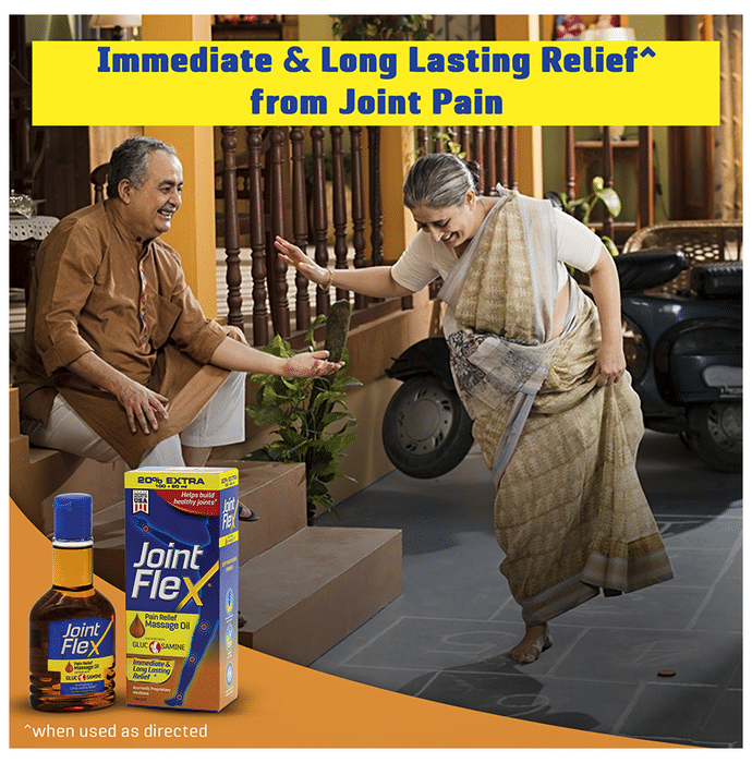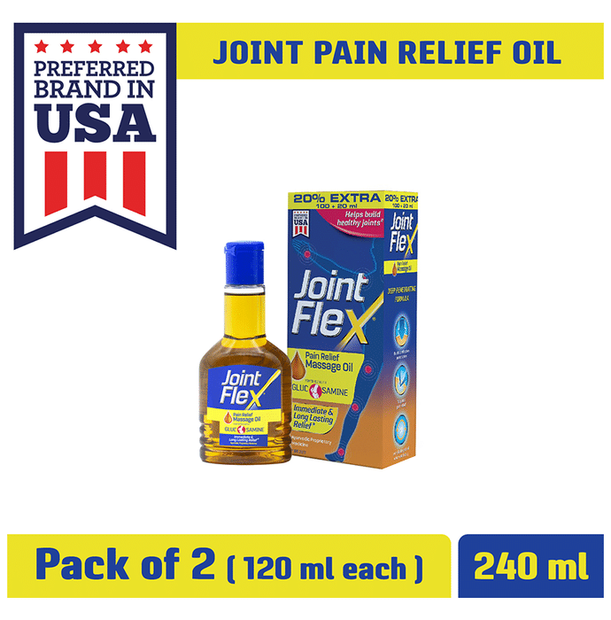 Joint Flex Pain Relief Massage Oil is a pain-relieving remedy for joint-related discomfort. Formulated with fast-acting ingredients to help in relieving pain associated with arthritis. JointFlex has a unique skin delivery system that has a deep penetration effect and provides quick relief when applied to the affected areas. Comes in 2 bottles of 120 ml. | Key Ingredients: Camphor Acetylated Lanolin Alkyl Acrylate Crosspolymer Aloe Vera Alkyl Benzoate Chondroitin Sulfate Diazolidinyl Urea Panthenol | Key Benefits: Provides relief from the pain associated with arthritis and joint degeneration It quickly penetrates the top 2 skin layers and delivers pain-relievers right to the pain sources Useful in relieving muscle sprains and strains Provides alleviation from all major joint pain and stiffness Fortified with glucosamine, it repairs and regenerates joint cartilage to give long-lasting relief from joint pain | Directions For Use: Apply 5-10 ml or more depending on the affected area and massage till absorbed. Use twice a day. | Safety Information: Read the label carefully before use Use under medical supervision Store in a cool and dry place away from direct sunlight Keep away from children For external use only