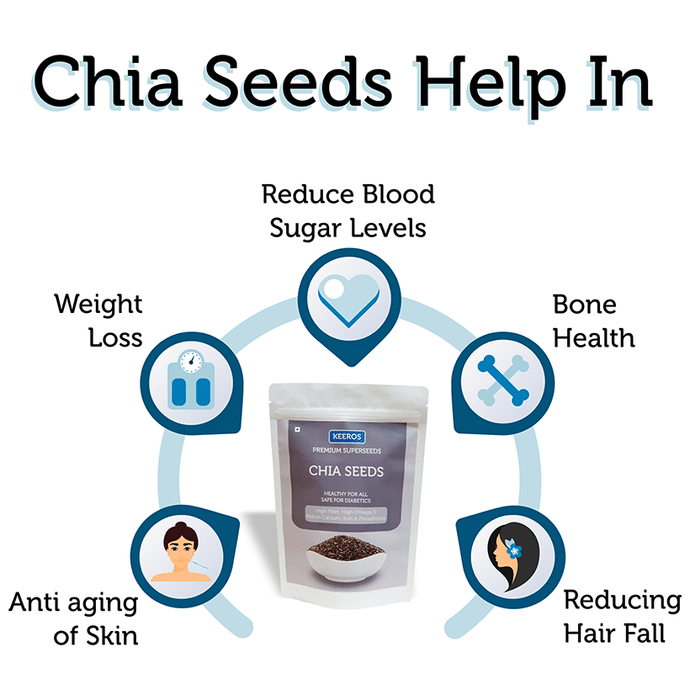 Keeros Premium Chia Seeds is a rich source of omega-3 fatty acids and has an abundance of various minerals and vitamins. They also contain mucilaginous fibre that aids the process of losing weight. Chia seeds have been known to be the highest source of protein available in the form of a plant. These seeds can be consumed as soaked and added to porridge, made into pudding, taken with smoothies and juices, or sprinkled on top of salads or yoghurt. | Key Ingredients: Chia seeds | Key Benefits: Chia seeds help to boost metabolism and improves digestive health It contains mucilaginous fibre which is helpful for those who are trying to lose weight It is also rich in dietary fibre that helps in maintaining bowel health It helps in maintaining healthy cholesterol levels | Directions For Use: Read the label carefully before use. | Safety Information: Read the label carefully before use Do not exceed the recommended dosage Store in a cool and dry place away from direct sunlight Keep out of reach of children