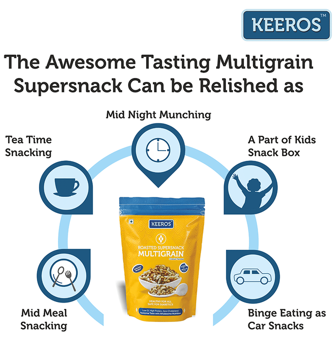 Keeros Roasted Supersnack Multigrain is Low GI Sugar-free snack. It is also a healthy snack for weight loss and a good alternative to fried snacks and namkeens. Having Zero Cholesterol and Zero Trans-Fats, this Diet food snack is good for Heart Health. So make Keeros the essential diet snacks in your pantry. | Key Ingredients: White Wheat Dew Beans Soyabeans Rice Flakes Green Grams | Key Benefits: It is also rich in dietary fibre that helps in maintaining bowel health It is made from high-quality ingredients to ensure authentic taste High-fibre, protein-rich and a powerhouse of vitamins and essential minerals from oats and fruits | Directions For Use: Read the label carefully before use. | Safety Information: Read the label carefully before use Do not exceed the recommended dosage Store in a cool and dry place away from direct sunlight Keep out of reach of children