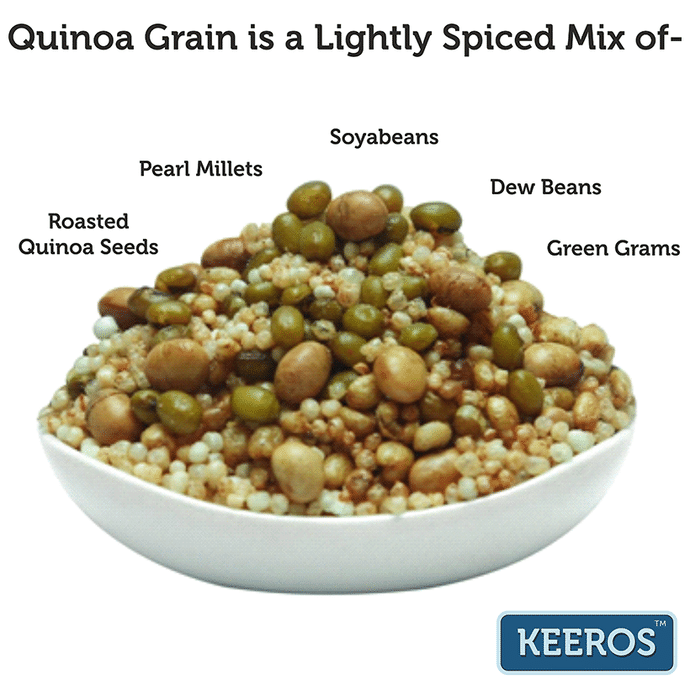 Keeros Roasted Supersnack Quinoa Grain is Low GI, gluten free and sugar-free snack. Keeros Quinoa grain has a superfood mix rich in Antioxidants, Vitamins, Iron and Magnesium. Magnesium is essential for carrying out the proper functioning of enzymes. Hence, it can act as a bone health food and Immunity booster. Quinoa contains insoluble fibre, which improves the digestive process and helps in reducing the risk of bloating, pain, constipation, and gas. | Key Ingredients: Roasted quinoa seeds Pearl millets Soyabeans Dew beans Green grams | Key Benefits: Quinoa is rich in antioxidants and helps to prevent the risk of heart diseases, helps lower blood sugar levels and cholesterol It helps with regulating blood sugar levels and can be used by a lot of people restricted by diets It is also rich in dietary fibre that helps in maintaining bowel health It is optimal breakfast that supports healthy weight loss | Directions For Use: Read the label carefully before use. | Safety Information: Read the label carefully before use Do not exceed the recommended dosage Store in a cool and dry place away from direct sunlight Keep out of reach of children