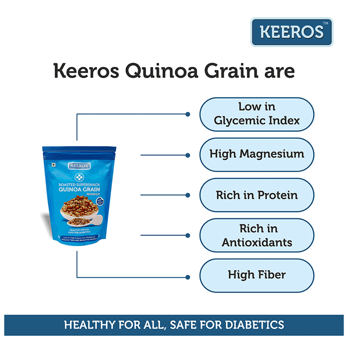 Keeros Roasted Supersnack Quinoa Grain (250gm Each) Classic Keeros Roasted Supersnack Quinoa Grain is Low GI, gluten free and sugar-free snack. Keeros Quinoa grain has a superfood mix rich in Antioxidants, Vitamins, Iron and Magnesium. Magnesium is essential for carrying out the proper functioning of enzymes. Hence, it can act as a bone health food and Immunity booster. Quinoa contains insoluble fibre, which improves the digestive process and helps in reducing the risk of bloating, pain, constipation, and gas.