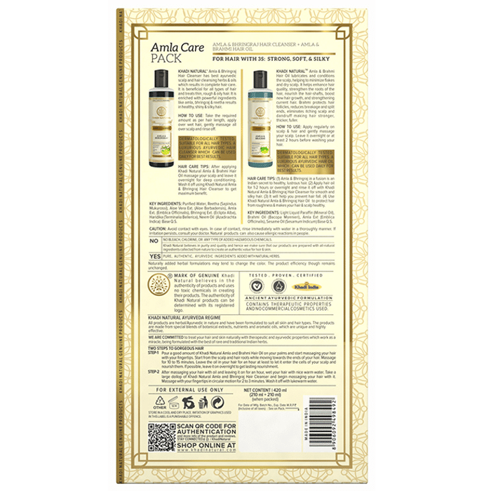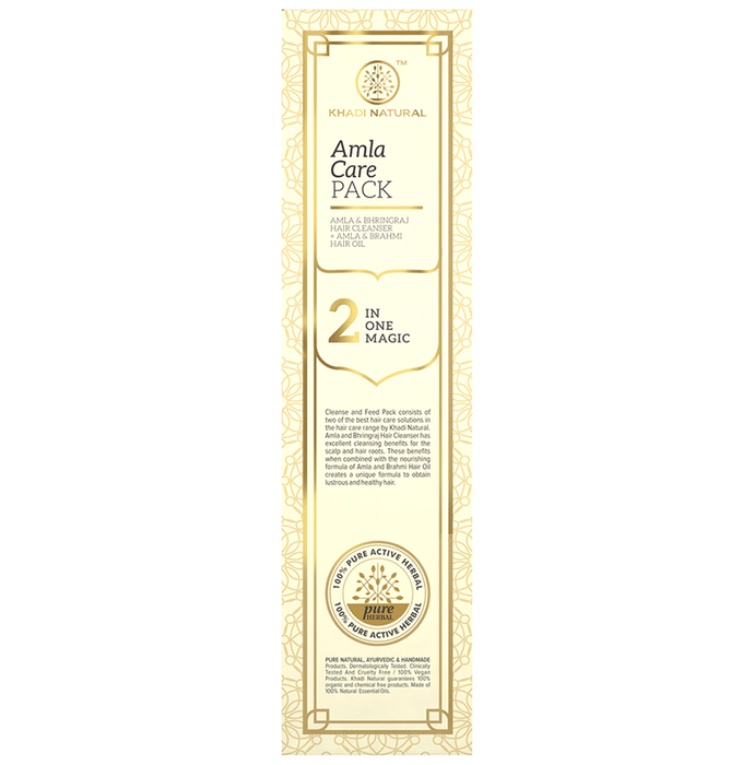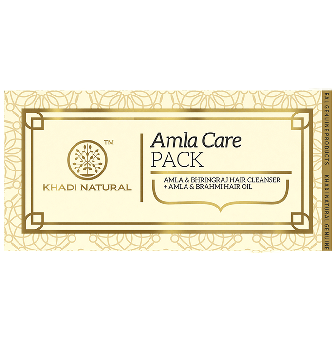 Khadi Naturals Amla Care Pack (210ml Each) Khadi Naturals Amla Care Pack Its nutrient-rich hair and scalp cleanser and oil are infused with the goodness of amla, bhringraj and brahmi leaving hair with natural lustre, volume and essence. This cleanser and oil contain natural cleansing herbs that help in gently cleanse the scalp by replenishing the natural oil of the hair. It also ensures circulation of blood especially near the scalp by nourishing the hair follicles.