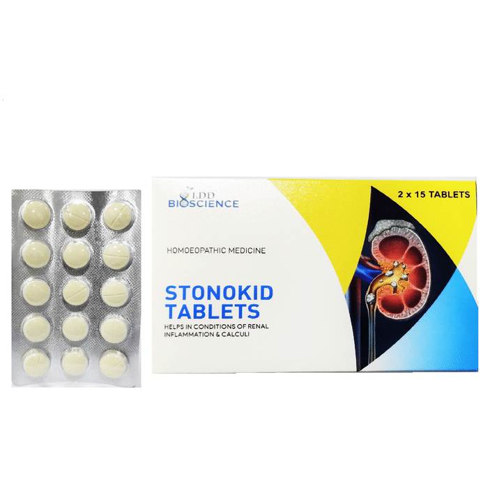 LDD Bioscience Stonokid Tablet It is a homoeopathic remedy that supports your urinary and renal health. It helps in the conditions of renal inflammation and calculi. | Key Ingredients: Cantharis 3x Dioscorea villosa 3x Petroselinum sativum 3x Stigmata maydis 1x Thuja occidentalis 6x Uva ursi 6x Vesicaria communis 6x | Key Benefits: It is a homoeopathic remedy that supports your urinary and renal health It helps in the conditions of renal inflammation and calculi It may help reduce the burning sensation in the urine It relieves inflammation of the bladder with gravels and stones in the urine | Directions For Use: Use as directed on the label or as advised by your physician | Safety Information: Read the product label carefully before use Store in a cool and dry place away from direct sunlight Keep out of reach of children Consult a doctor before taking any supplement Do not exceed the recommended dosage Pregnant or nursing mothers, children, and people with medical conditions must consult a physician before taking this supplement