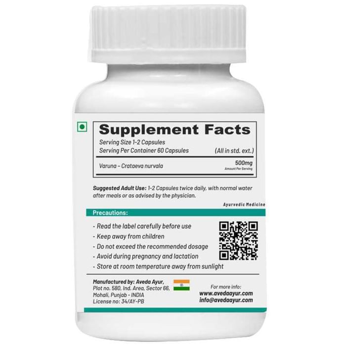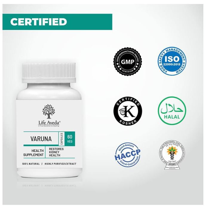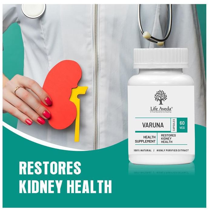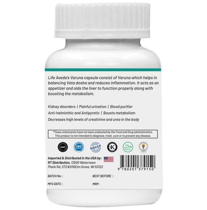 Life Aveda Varuna Veg Capsule Life Aveda Varuna Veg Capsule is a natural supplement made from Varuna (Crataeva nurvala) which is a diuretic herb that helps in purifying blood and maintains Homeostasis. Varuna Veg Capsule helps with liver-related issues, inflammation and bowel movement. It is known for increasing appetite and the rate of metabolism in the human body. It also helps in balancing Vata dosha and reducing inflammation. People who have urinary and liver-related issues can benefit from this.