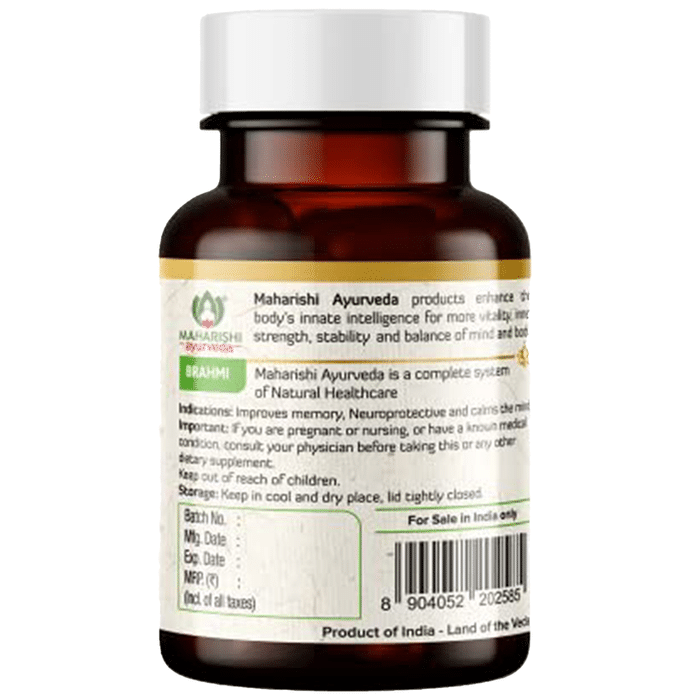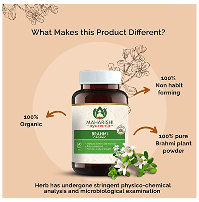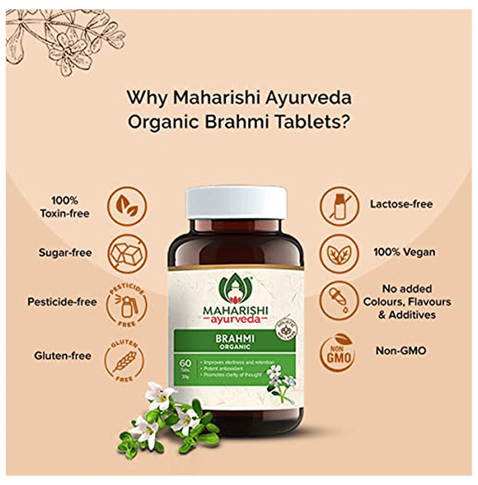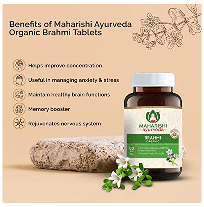 Maharishi Ayurveda Organic Brahmi Tablet Maharishi Organic Brahmi Tablet contains brahmi which is often regarded as a brain booster which helps in enhancing memory retention power. It helps in treating inflammation, ulcers and gout. It is useful aiding the treatment of Arthritis and strengthening the immune system.