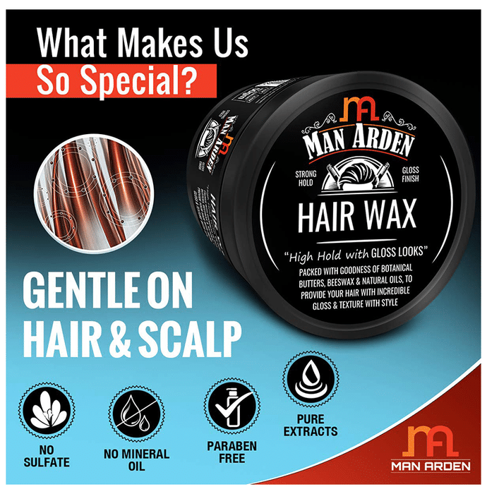 Man Arden Hair Wax High Hold with Gloss Looks Man Arden Hair Wax with its strong hold and glossy finish is the perfect hair grooming product for the fashion conscious men. It offers enough hold to create the spiky hairstyle with least effort. With the touch of hair wax you can easily tame the stubborn flyaway hairs.