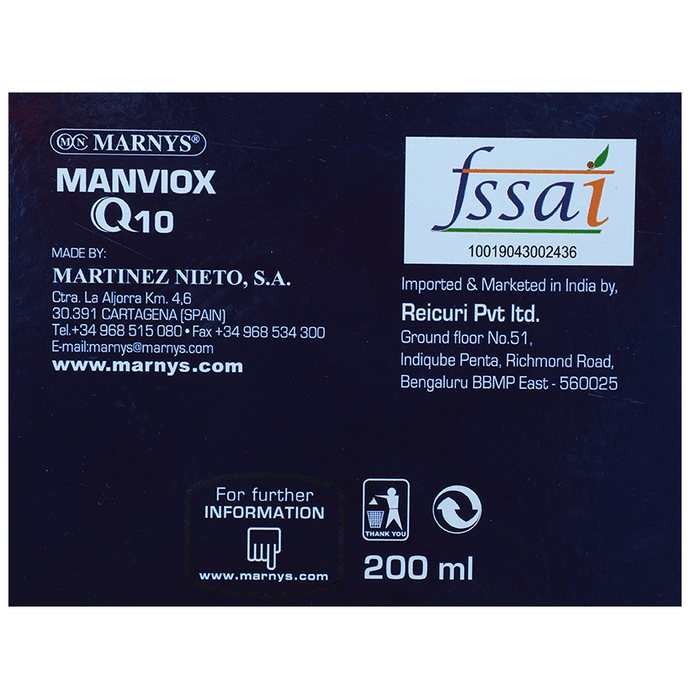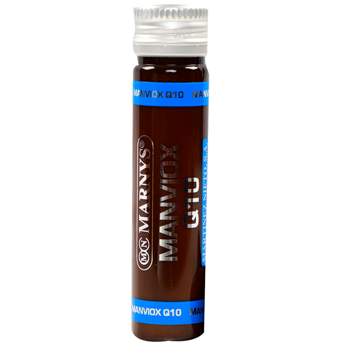 Marnys Manviox Q10 Vial (10ml Each) is a unique combination of Mangosteen, Co-enzyme Q10, Royal Jelly, grape seeds, B complex and vitamins A, C, D3 and K2 for the visible signs of ageing. Manviox Q10 is presented in liquid form, in convenient single-dose drinkable vials providing 100mg of CoQ10 with high bioavailability; Mangosteen in 5:1 concentrate; and Grape seeds guarantee a minimum proanthocyanidin (OPCs) content of 95%. Manviox Q10, a combination of ingredients that provide the following properties - Vitamin C contributes to the normal production of collagen for the normal function of skin, bones, cartilage and blood vessels. Grape seeds and Vitamin C contribute to cellular protection from oxidative damage. Grape seeds also contribute to normal circulatory and cardiovascular function Mangosteen (Garcinia mangostana) is considered 'the queen of fruits' and its composition consists of over 45 types of Xanthones (a type of flavonoids), Tannins, Anthocyanidins and Phenols, among other bioactive constituents. Manviox Q10 contains Mangosteen in a 5:1 ratio, that is, 100mg of the extract are equivalent to 500mg of Mangosteen. Vitamins B6 and B12 contribute to normal homocysteine metabolism, red blood cell formation and immune system function. Riboflavin (vitamin B2) and Thiamine (vitamin B1) contribute to normal energy-yielding metabolism and to the normal function of the nervous system. In addition, Vitamin B2 contributes to the normal maintenance of vision and to the reduction of tiredness and fatigue; while Thiamine contributes to normal heart function. Vitamin A and Biotin (vitamin B8) contribute to the normal maintenance of mucous membranes and skin. Moreover, Vitamin A contributes to normal iron metabolism, and Biotin contributes to the normal maintenance of hair. Vitamins D3 and K2 contribute to the maintenance of normal bones. Furthermore, vitamin D3 contributes to normal absorption/use of both Calcium and Phosphorus, and to normal muscle function. Vitamin K2 contributes to normal blood coagulation. Manviox Q10 is an excellent supplement for people who want to promote their normal metabolic process and contribute to the maintenance of normal collagen levels in the skin and other tissues. It is also helpful for good circulatory and cardiovascular function, as well as for normal bone maintenance. Manviox Q10 is available in convenient, single-dose drinkable vials, sweetened with stevia. | Key Ingredients: Deionized water Royal jelly Olive oil Mangosteen (Garcinia mangostana) extract powder Grape seed (Vitis vinifera) extract powder Co-enzyme Q10 extract powder Vitamin C Vitamin B6 Riboflavin (vitamin B2) Thiamine (vitamin B1) Vitamin A Folic acid Vitamin K2 Biotin Vitamin D3 Vitamin B12 | Key Benefits: Helps combat free radicals Helps with visible signs of ageing Contributes to normal production of collagen Provides cellular protection from oxidative damage | Directions For Use: Take 1 vial a day Shake well before use | Safety Instructions: Read the label carefully before use Store in a cool dry place away from direct sunlight Keep out of reach of the children Food supplements should not be used as a substitute for balanced nutrition It is recommended to keep a varied and balanced diet and healthy lifestyle Do not exceed the recommended daily dose Do not store at a temperature above 30ºC