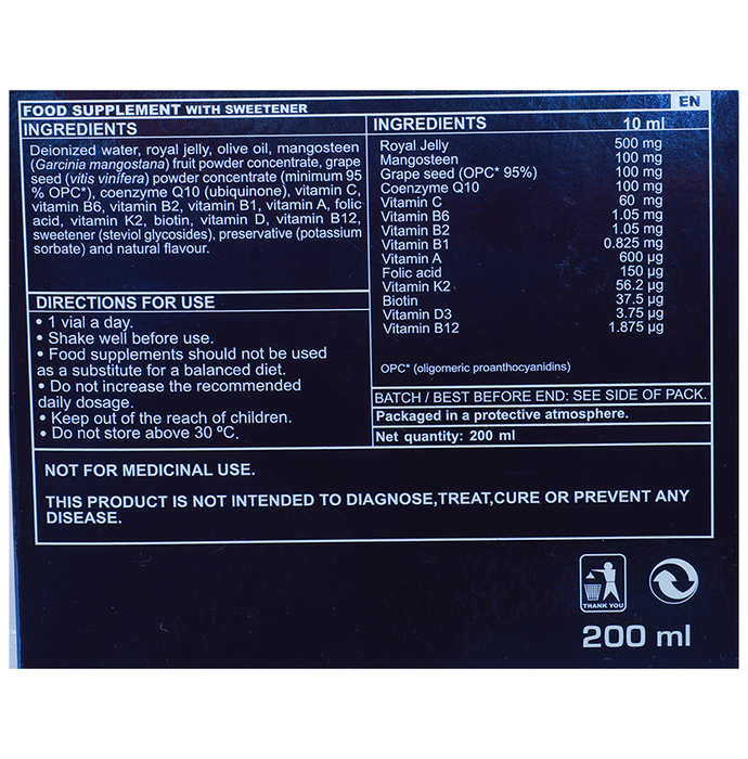 Deionized water | Royal jelly | Olive oil | Mangoteen (Garcinia mangotana) extract powder | Grape eed (Viti vinifera) extract powder | Co-enzyme Q10 extract powder | Vitamin C | Vitamin B6 | Riboflavin (vitamin B2) | Thiamine (vitamin B1) | Vitamin A | Folic acid | Vitamin K2 | Biotin | Vitamin D3 | Vitamin B12