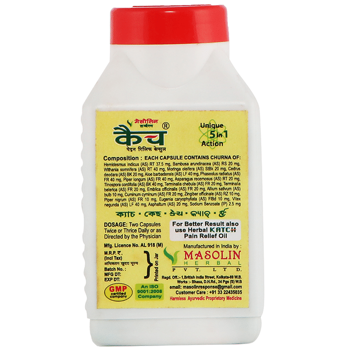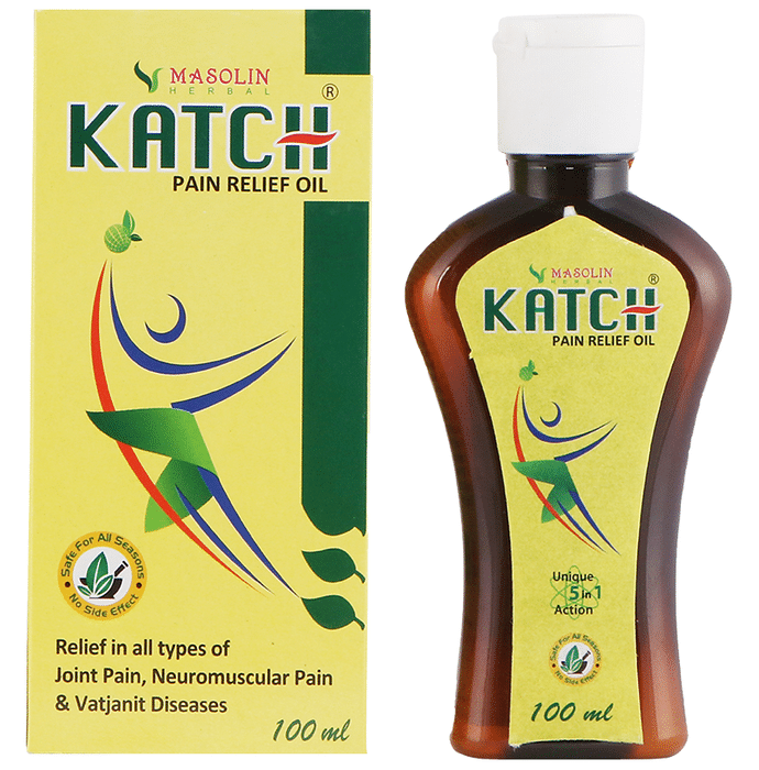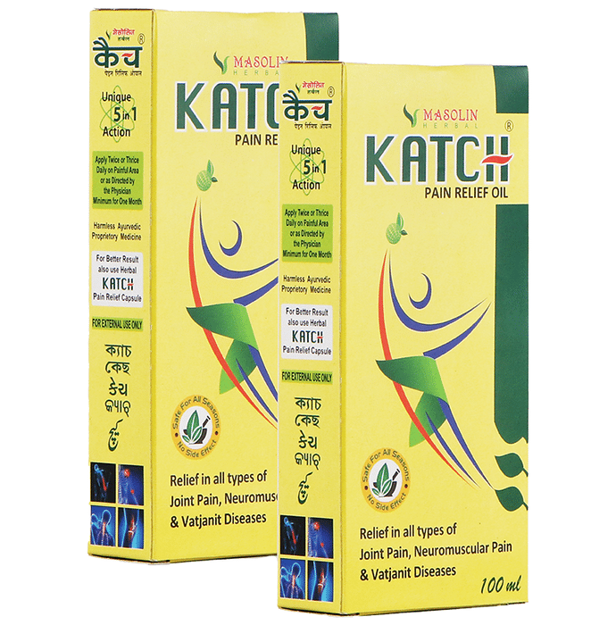 Masolin Herbal Combo Pack of 2 Bottle of Katch Pain Relief Capsule (60 Each) & 2 Bottle of Katch Pain Relief Oil (100ml Each) Masolin Herbal Pain Relief Combo Pack is a combo pack consisting of Masolin Pain Relief Capsule and Masolin Pain Relief Oil. They work together to provide effective relief from several kinds of joint pain. They may also be suggested for a number of painful conditions such as arthritis, spondylitis, lumbago, joint pain, neuromuscular pain, stiffness, inflammation, gout etc. They consist of natural ingredients such as anantmul, shunth, ashwagandha etc. which are safe and effective. Regular usage of these capsules and oil might ease movement of joints, help with pain and reduce inflammation.
