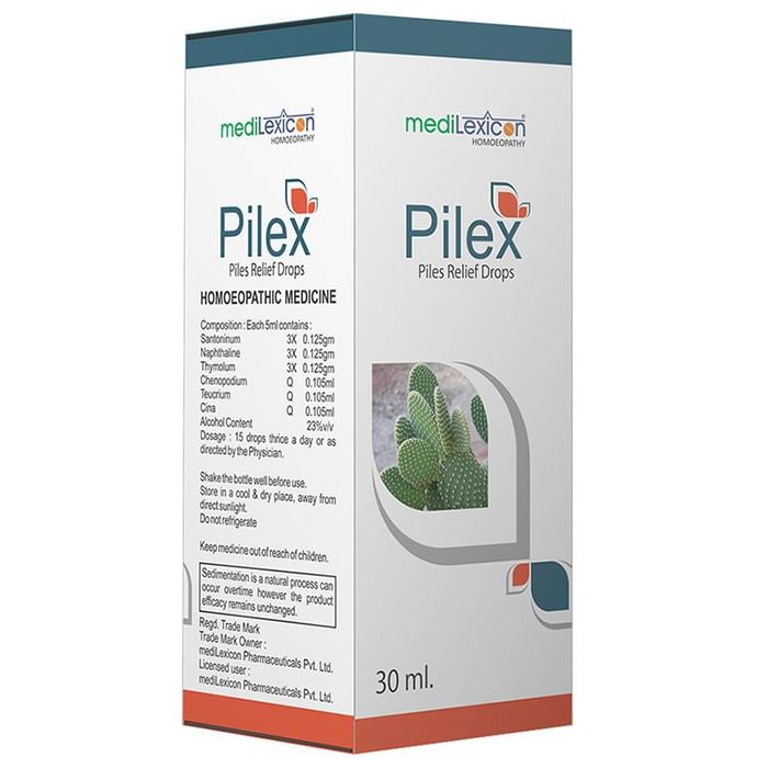 Medilexicon Pilex Piles Relief Drop is an Ayurvedic formulation that provides the combined effects of herbs. It contains detoxifying and laxative properties and anti-inflammatory properties. The combined effect of these ingredients helps to provide relief from piles (haemorrhoids), anal fistula and constipation. According to Ayurveda, the Rechana (laxative) property provides effective aid in the treatment of constipation. | Key Ingredients: Santoninum Naphthaline Tymolum Chenopodium Teucrium Cina | Key Benefits: It works by stimulating the digestive fire, which in turn relieves constipation This further prevents piles and gives relief from the pain, swelling and other discomfort associated with it It also helps reduce the symptoms of anal fistula It can help in weight management due to its laxative properties It improves agni (the digestive fire), which helps promote healthy metabolism and releases excess kapha from the system It is considered safe when taken in the prescribed quantity These properties work in sync in improving the digestive fire, which helps in providing relief from constipation | Directions For Use: Read the label carefully before use. | Safety Information: Read the label carefully before use Store in a cool and dry place away from direct sunlight Keep out of reach of children