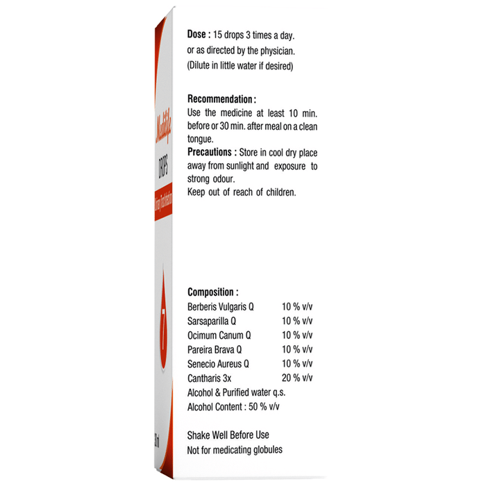 Medilife No 7 Urinary Tract Infection Drop is indicated for treating renal colic and urinary tract infections. It also reduces the pain and burning sensation during urination and curtails the frequent desire to urinate. | Key Ingredients: Berberis vulgaris Q 10% Sarsaparilla Q 10% Ocimum canum Q 10% Pareira brava Q 10% Senecio aureus Q 10%, Cantharis 3x 20% Alcohol purified water q.s Alcohol content 50% v/v | Key Benefits: This homeopathy drop helps treat renal colic and urinary tract infections It provides relief from the burning and painful sensation caused during urination It also helps in curtailing the frequent desire to urinate | Directions For Use: 15 Drops 3 times a day (dilute in little water if desired) or as directed by the physician. | Safety Information: Read the label carefully before use Store in a cool and dry place, away from sunlight Keep out of reach of children