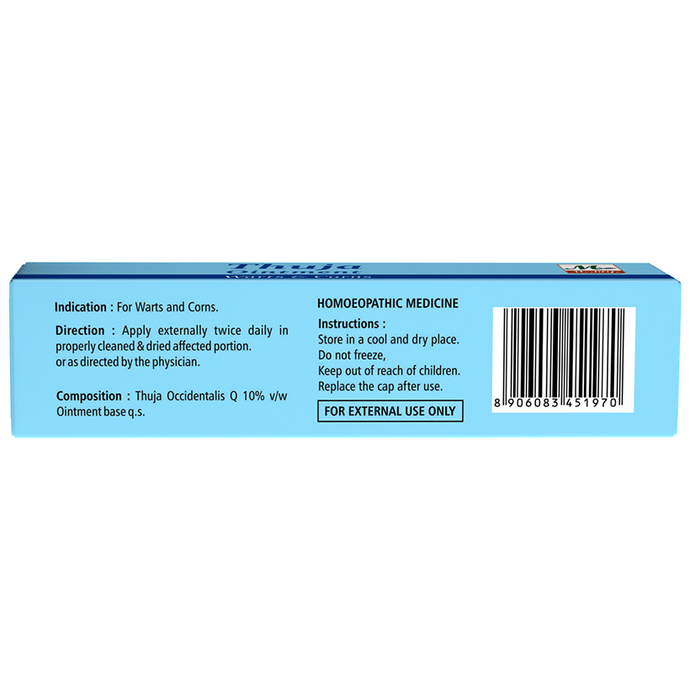 Medilife Thuja Ointment Medilife Thuja Ointment is a homoeopathy formulation which is helpful in the shrinking of warts and moles present on your skin. Warts are an accumulation of skin cells on a particular stop. Thus, this ointment helps give your face a clean look by removing warts and moles on your face whenever they appear. It may also address other minor skin problems like polyps, tubercles, corns, brown spots and eruptions.