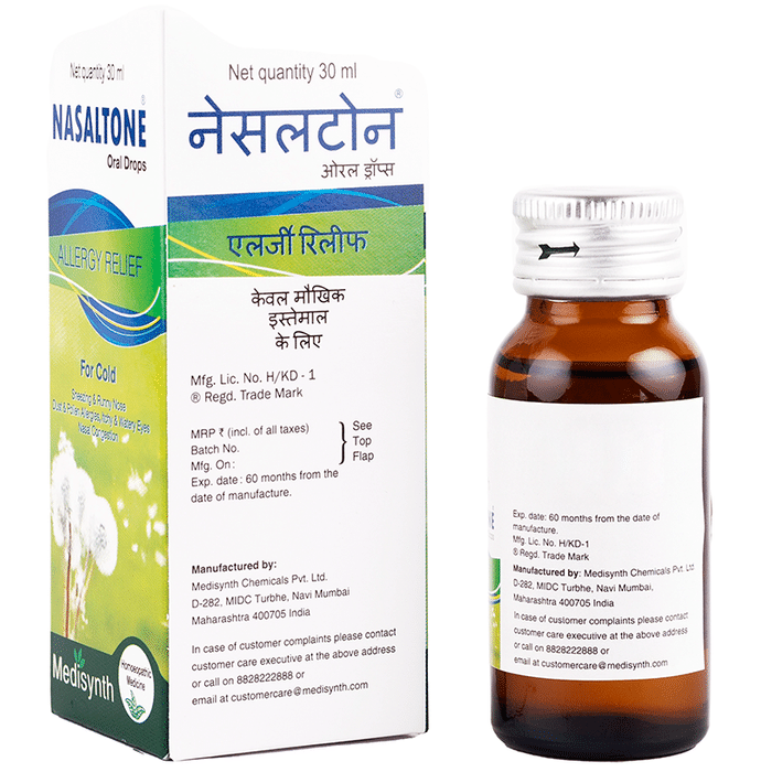Medisynth Nasaltone Oral Drop is effective for the treatment of allergy, cold and flu, runny nose and sneezing, nasal congestion, fever, headache, sore throat, pollen and dust allergy, itchy and watery eyes. | Key Ingredients: Allium Cepa 30 NatrumMuriaticum 30 SinapisNigra 30 Arum Dracontium 30 | Key Benefits: Controls allergy, stops runny nose and sneezing Reduces nasal congestion Relieves fever and headache Helps in pharyngitis and sore throat Treats acute and chronic cold and flu Effective during sore throat, pollen and dust allergy Cures itchy and watery eyes | Directions For Use: 5 to 10 drops 2 to 3 times in a day for adults; half of the adult dose for children or as prescribed by the physician | Safety Information: Read the label carefully before use Do not exceed the recommended dose Keep out of the reach of children