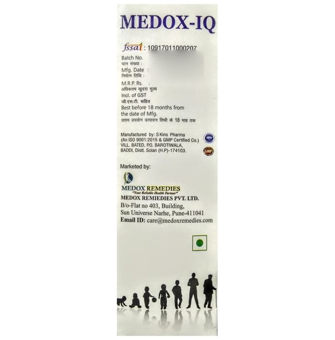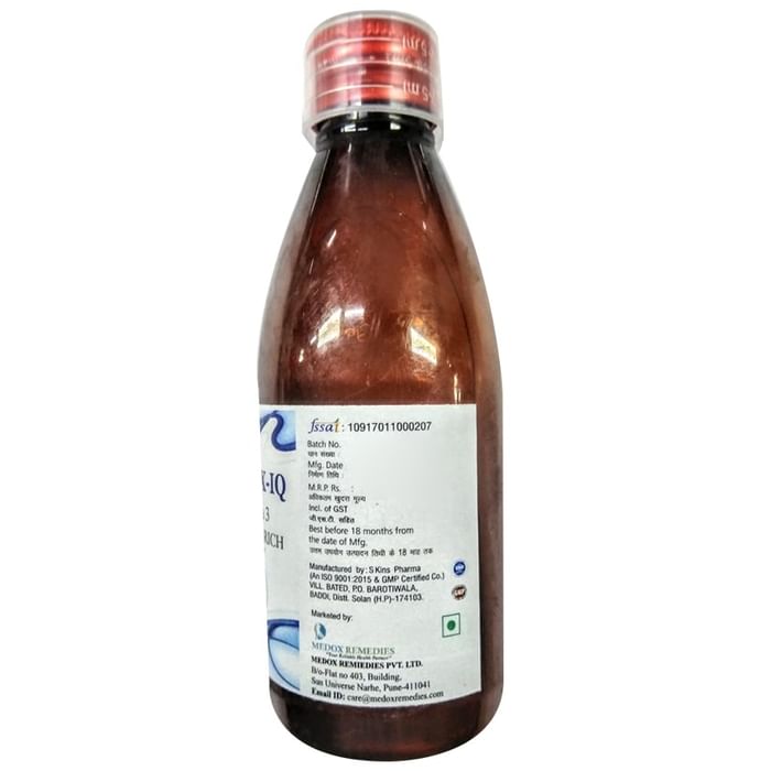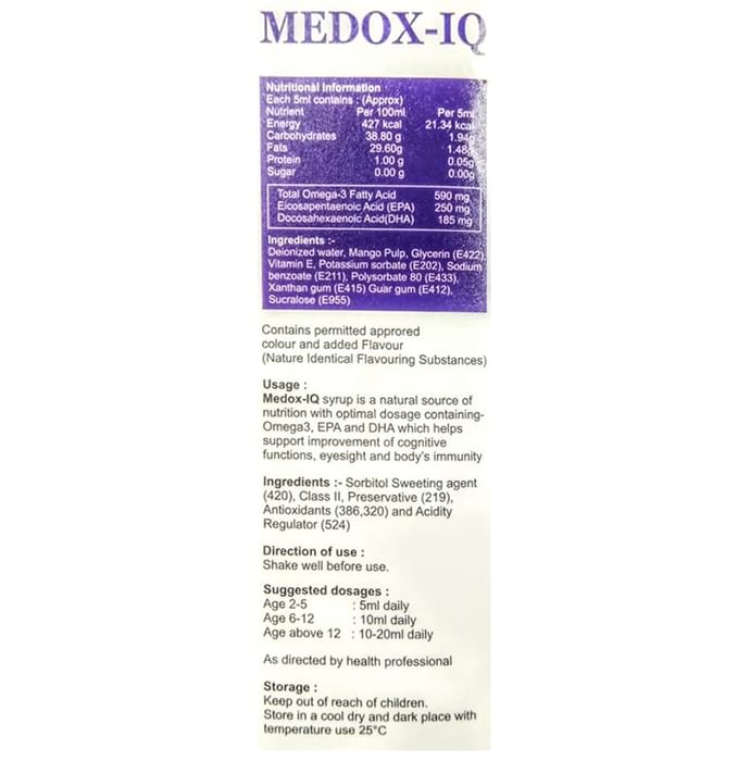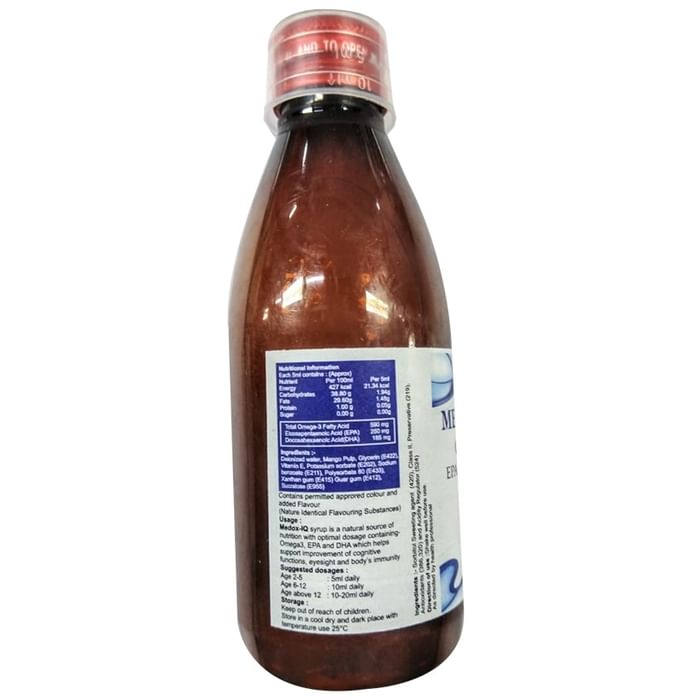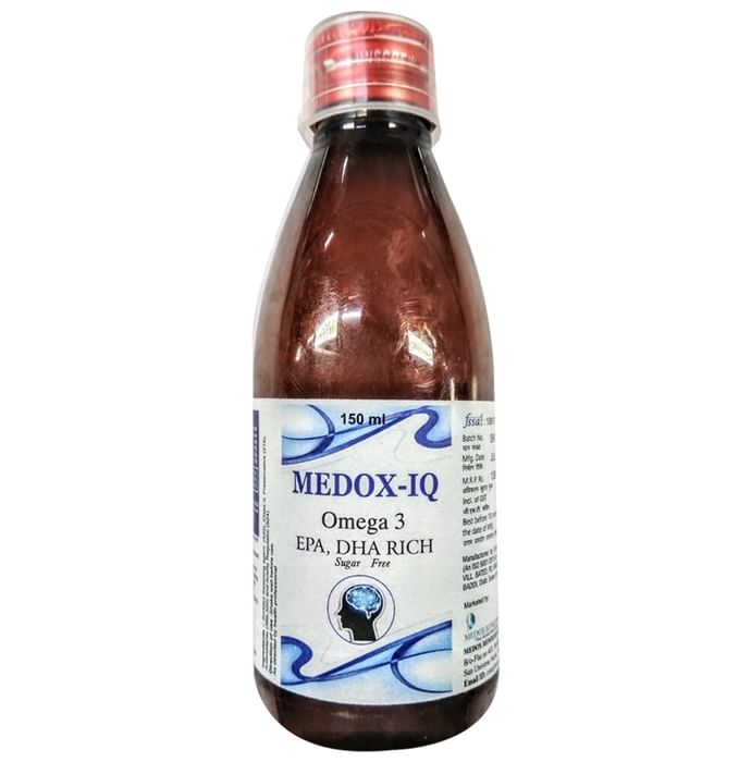 Medox-IQ Syrup provides 1000 mg (EPA 460 mg + DHA 380 mg) of extremely concentrated, enteric-coated Omega 3. It is a high-quality vegan, vegetarian and fish-free source of omega that helps promote heart, eye and brain health. | Key Ingredients: Omega 3 | Key Benefits: These essential fats are vital for the optimal function of cells in the body It aids in improving concentration and attention span, boosts memory power, and so on It has several immunity-boosting properties that help fight off infections from pathogens and has several anti-inflammatory properties | Directions For Use: Read the label carefully before use | Safety Information: Do not exceed the recommended dosage Store in a cool and dry place away from direct sunlight Keep out of reach of children