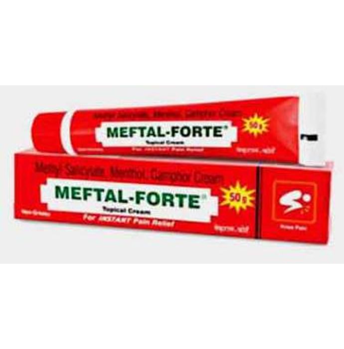 Meftal-Forte Cream Meftal-Forte cream contains Camphor, Methyl Salicylate and Menthol. Role of key ingredients: Methyl Salicylate has pain-relieving effects, which can help alleviate headache, muscle cramps, joint pain, tendonitis, and bone pain. Camphor is used topically to increase local blood flow which reduces pain and swelling by causing irritation. Mentho is used to treat minor aches and pains of the muscles and joints. Meftal-Forte cream is indicated in sprains and strains, sports injuries, sciatica, lumbago, acute muscular pain, joint pain and low back pain. It can also help in treating pain caused in muscles and minor aches or cramps Directions to use: Apply the cream on the affected area and rub gently. 2-3 applications should be done during the day. Use under medical supervision.