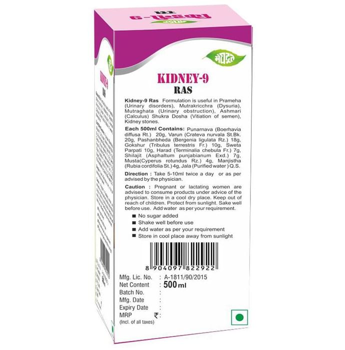 Meghdoot Kidney 9 Ras helps treat painful urinary disorders, it also facilitates vitiation of semen and blockage of flow of urine out of the body. It is known to soothe and protect irritated or inflamed internal tissue. The formulation helps in the treatment and prevention of crystals in the urine. Moreover, it helps in the removal of kidney stones and prevents the recurrence of stones. | Key Ingredients: Punarnava Varun tvak Pashanbheda Gokshur Sweta Parpati Harad Shilajit Musta Manjistha | Key Benefits: Effective in the treatment of kidney stones and pains associated with it Normalizes urinary pH and alleviates burning during urination Provides citrates and biomolecules for healthy and clear urine formation It has anti-oxidant and rejuvenating properties, thereby acts as a nephron-protective Reduces residual urine quantity and improves the tonicity of urinary bladder | Directions For Use: Use as directed by the physician. | Safety Information: Read the label carefully before use Store in a cool dry place away from direct sunlight Keep out of reach of the children