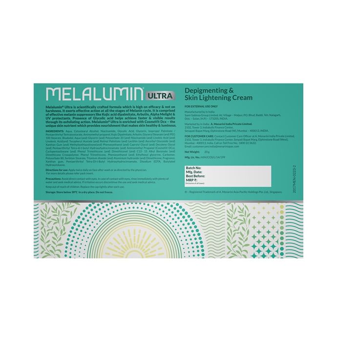 Melalumin Ultra Depigmenting Cream is a scientifically crafted formulation with niacinamide, glycolic acid, kojic acid, and arbutin, that can be effective in managing skin pigmentation naturally. It is high on efficacy and does not produce any harshness on the skin. | Key Ingredients: Niacinamide - 4% Glycolic acid - 3% Kojic acid - 2% Arbutin - 2% Alpha Melight - 1% Cosmevit DCX - 1% Microfine Ti02 - 0.5% | Key Benefits: This product actively works on all stages of the melanin cycle It can help manage skin pigmentation | Directions For Use: Clean your face with Melalumin face wash or other face wash of your choice Gently massage Melalumin cream all over your face Use twice daily for best results | Safety Information: Avoid direct contact with eyes If the product enters the eyes, rinse thoroughly with water Do not apply on damaged or broken skin If irritation or rash develops, discontinue the use and consult your physician Store at temperatures below 30C. Do not freeze Replace the cap tightly after each use Keep out of reach of children
