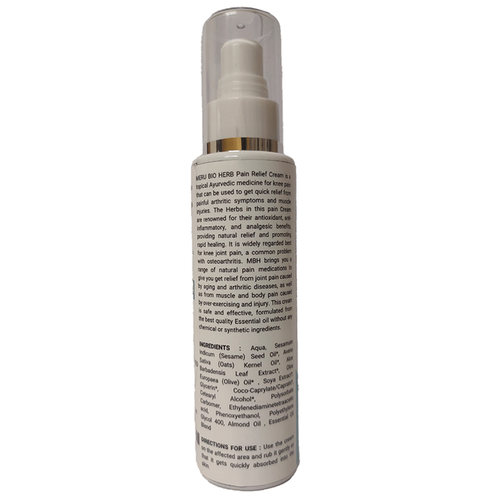 Meru Bio Herb Joint Pain Relief Cream Meru Bio Herb Joint Pain Relief Cream is a topical Ayurvedic formulation for knee pain that can help get quick relief from painful arthritic symptoms and muscle injuries. This cream is formulated with essential oils without any chemical or synthetic fragrance. The herbs in this cream have antioxidant, anti-inflammatory, and pain-relieving properties, which may provide relief and promote healing.