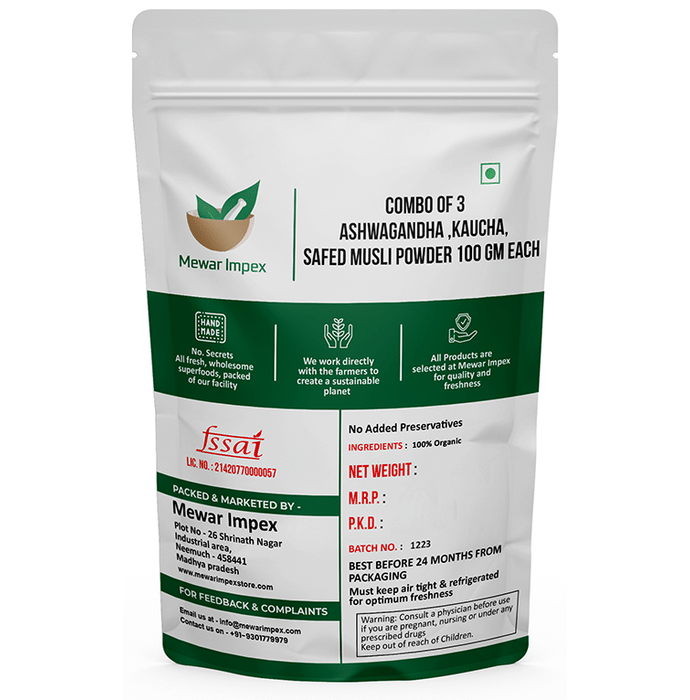 Mewar Impex Combo Pack of Organic Ashwagandha Powder, Organic Kaunch Seed Powder & Organic Shatavari Powder (100gm Each) Mewar Impex Combo Pack of Organic Ashwagandha Powder, Organic Kaunch Seed Powder & Organic Shatavari Powder (100gm Each) Shatavari powder is beneficial in boosting the immunity level of the body. Shatavari is helpful in relieving cough, diarrhoea and ulcers. Ashwagandha powder helps to assist the body to adapt to the negative effects of chronic stress by increasing energy, strength and stamina. Kaunch seed powder is beneficial in treating neurological disorders.