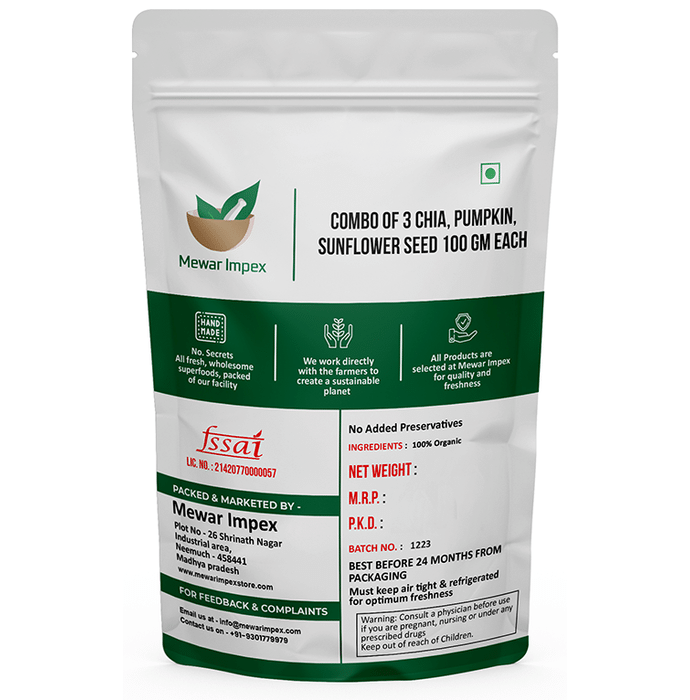 Mewar Impex Combo Pack of Organic Chia Seed, Organic Sunflower Seed & Organic Pumpkin Seed (100gm Each) Sunflower Seeds are harvested from the flower head of the sunflower plant. Chia seeds are known to be the highest source of protein available in the form of a plant. Pumpkin Seeds are little powerhouses of nutrients and health benefits. | Key Ingredients: Pumpkin seeds Chia seeds Sunflower seeds | Key Benefits: | Sunflower seeds Sunflower seeds improve heart health Sunflower seeds support the immune system They boost energy levels, keeping you active They are beneficial for heart diseases and blood pressure | Chia seeds It contains mucilaginous fibre which is helpful for those who are trying to lose weight Chia seeds are also useful in maintaining the body's overall health as they are a rich source of omega-3 Fatty acids It has an abundance of minerals and vitamins Chia seeds are a good source of protein | Pumpkin seeds Pumpkin seed may support blood sugar balance It may help to regulate blood pressure These seeds may help you sleep better Pumpkin seeds promote heart health | Directions For Use: Read the label carefully before use. | Safety Information: Read the label carefully before use Store in a cool and dry place away from direct sunlight Keep out of reach of children