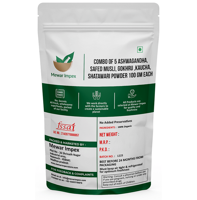 Mewar Impex Combo Pack of Organic Safed Musli Powder, Organic Ashwagandha Powder, Organic Kaunch Seed Powder, Organic Gokhru Powder & Organic Shatavari Powder (100gm Each) Mewar Impex Combo Pack of Organic Safed Musli Powder, Organic Ashwagandha Powder, Organic Kaunch Seed Powder, Organic Gokhru Powder & Organic Shatavari Powder (100gm Each) Ashwagandha powder helps to assist the body to adapt to the negative effects of chronic stress by increasing energy, strength and stamina. Shatavari powder is beneficial in boosting the immunity level of the body. Kaunch seed powder is beneficial in treating neurological disorders. Gokhru powder is known to promote a healthy digestive and cardiovascular system. Safed musli powder is an Ayurvedic herb that helps in improving libido and sexual function.